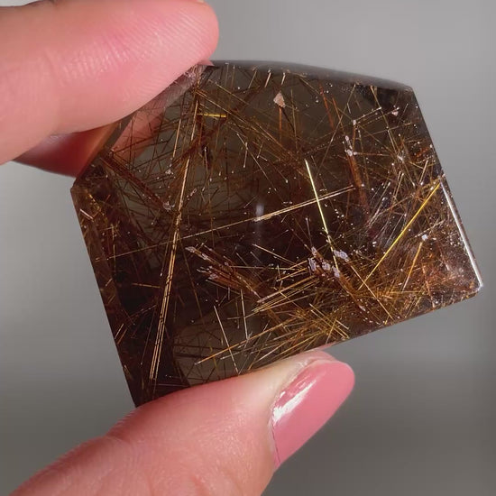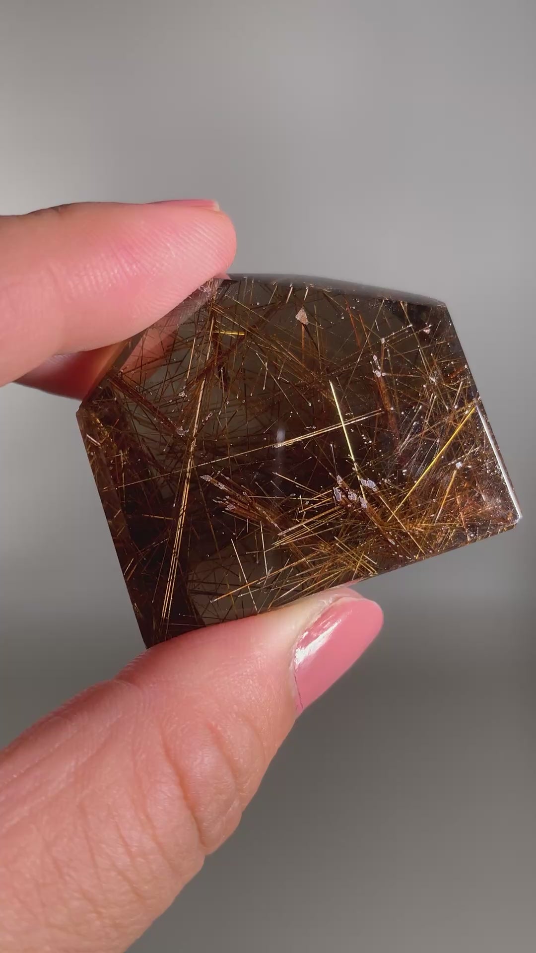 A high-quality smoky quartz polished freeform showcasing brilliant copper rutile inclusions suspended within a deep, translucent body. The vibrant copper threads shimmer against the smoky backdrop, creating a striking contrast and a captivating display of natural elegance and mineral richness.