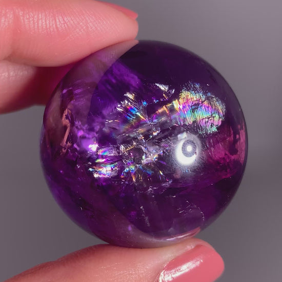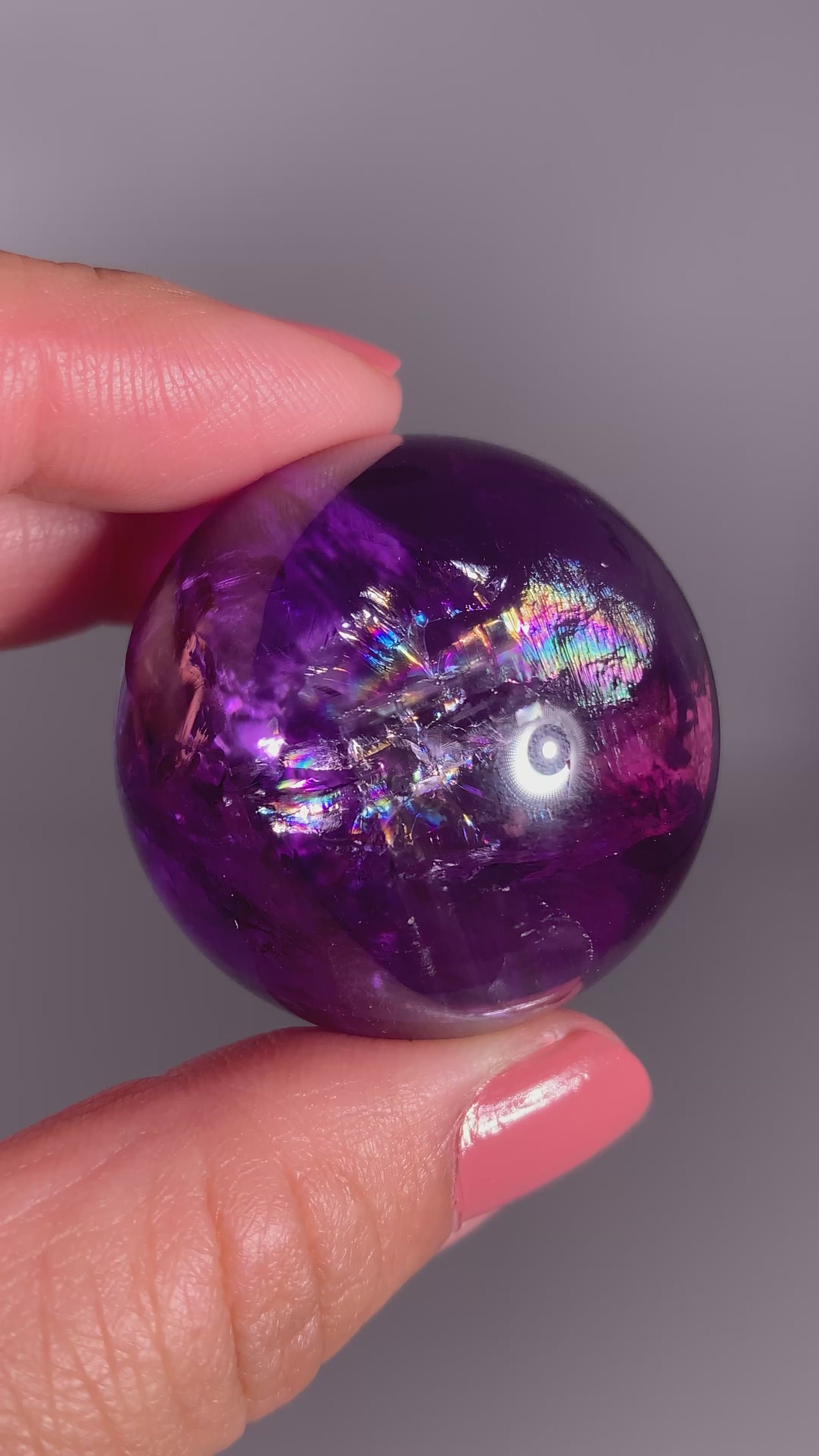 High-quality gem crystal amethyst sphere from Brazil featuring excellent clarity and a natural rainbow. A polished natural crystal ideal for collectors, display, or gifting.