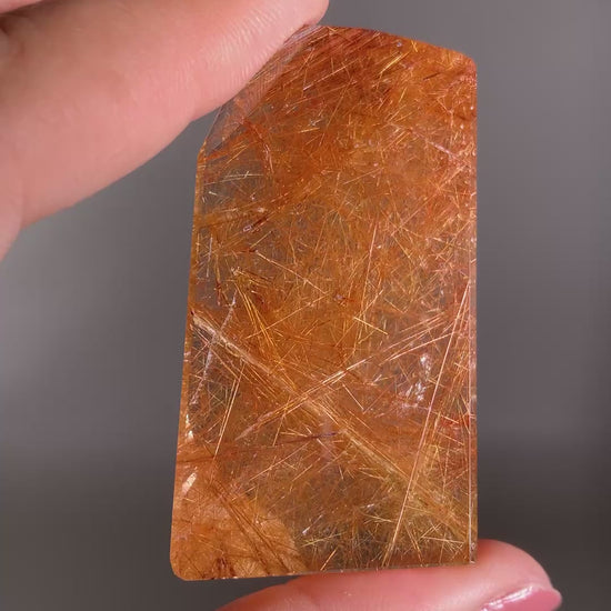 A high-quality richly packed polished freeform of clear quartz filled with vibrant copper rutile needles. The exceptional clarity of the quartz highlights the brilliance and structure of the rutile inclusions, creating a luminous, golden display.