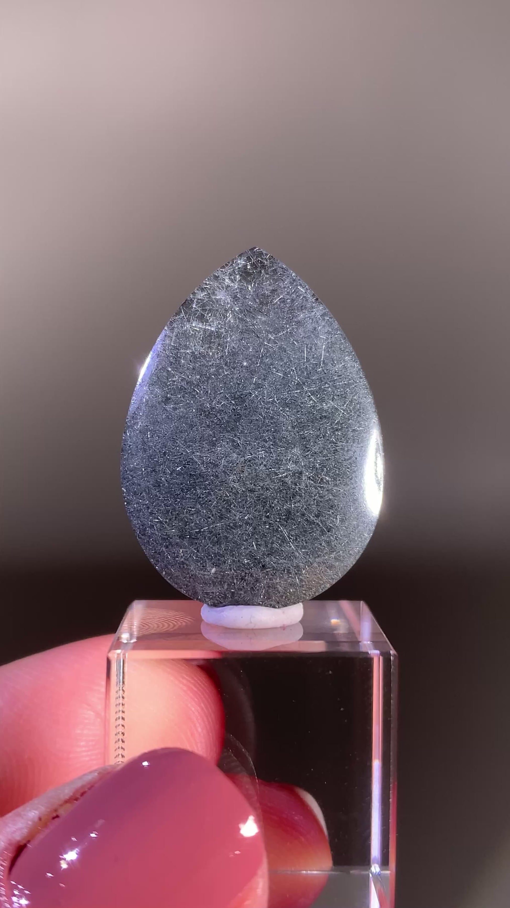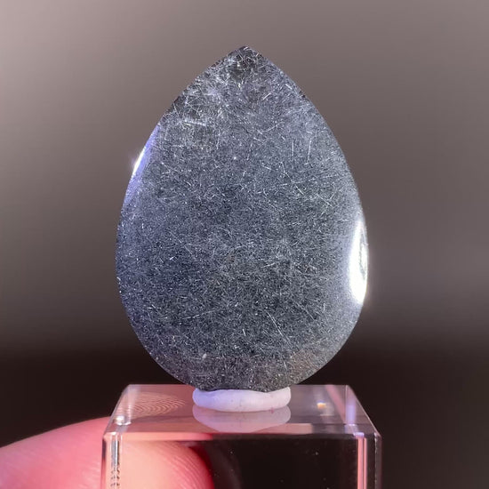 This high-quality Grey Rutile Quartz polished specimen from Brazil features fine grey rutile inclusions with a subtle blue tint suspended within clear quartz. The polished surface enhances clarity and depth, allowing the cool-toned rutile to softly shimmer as the light moves.