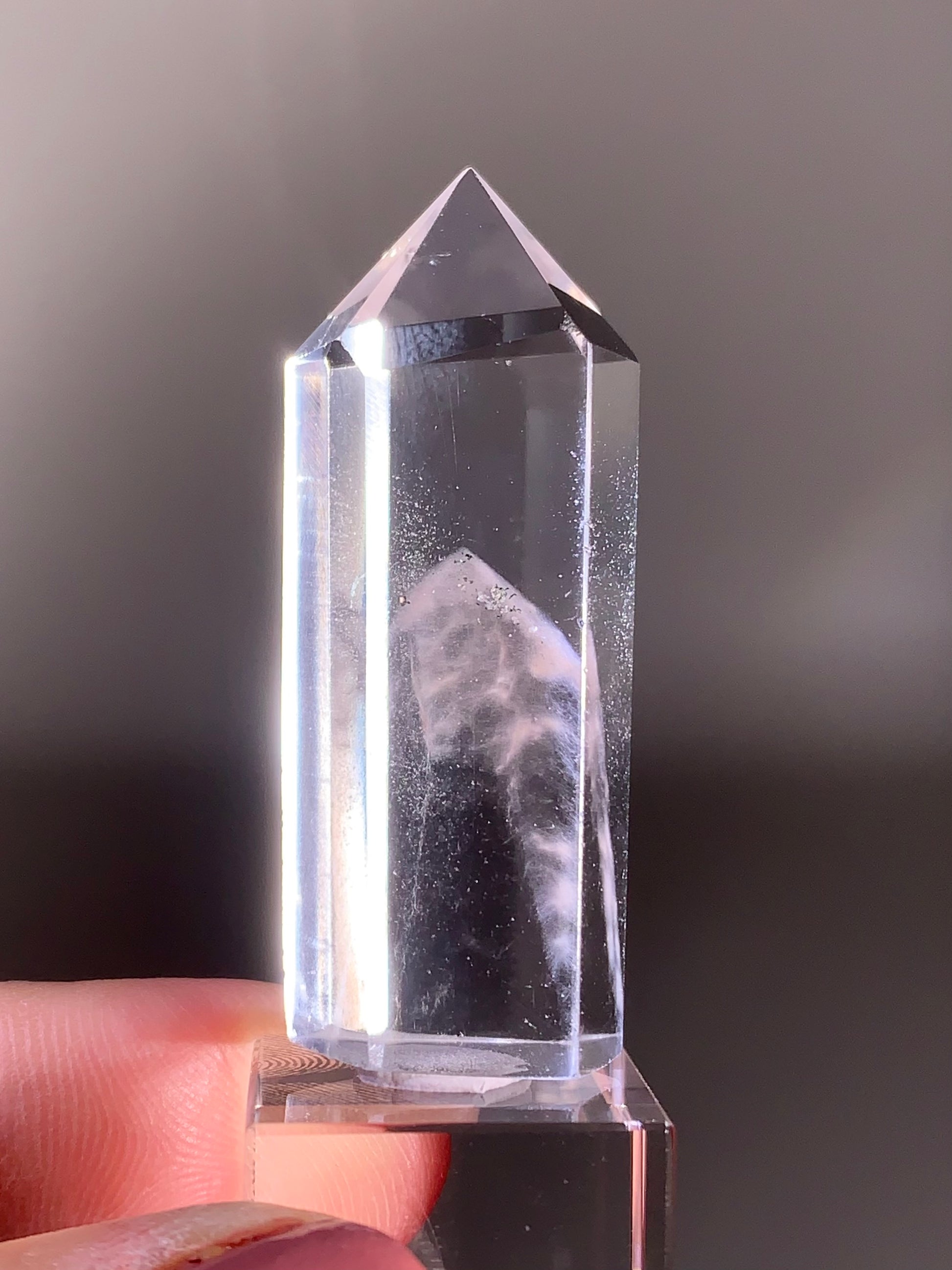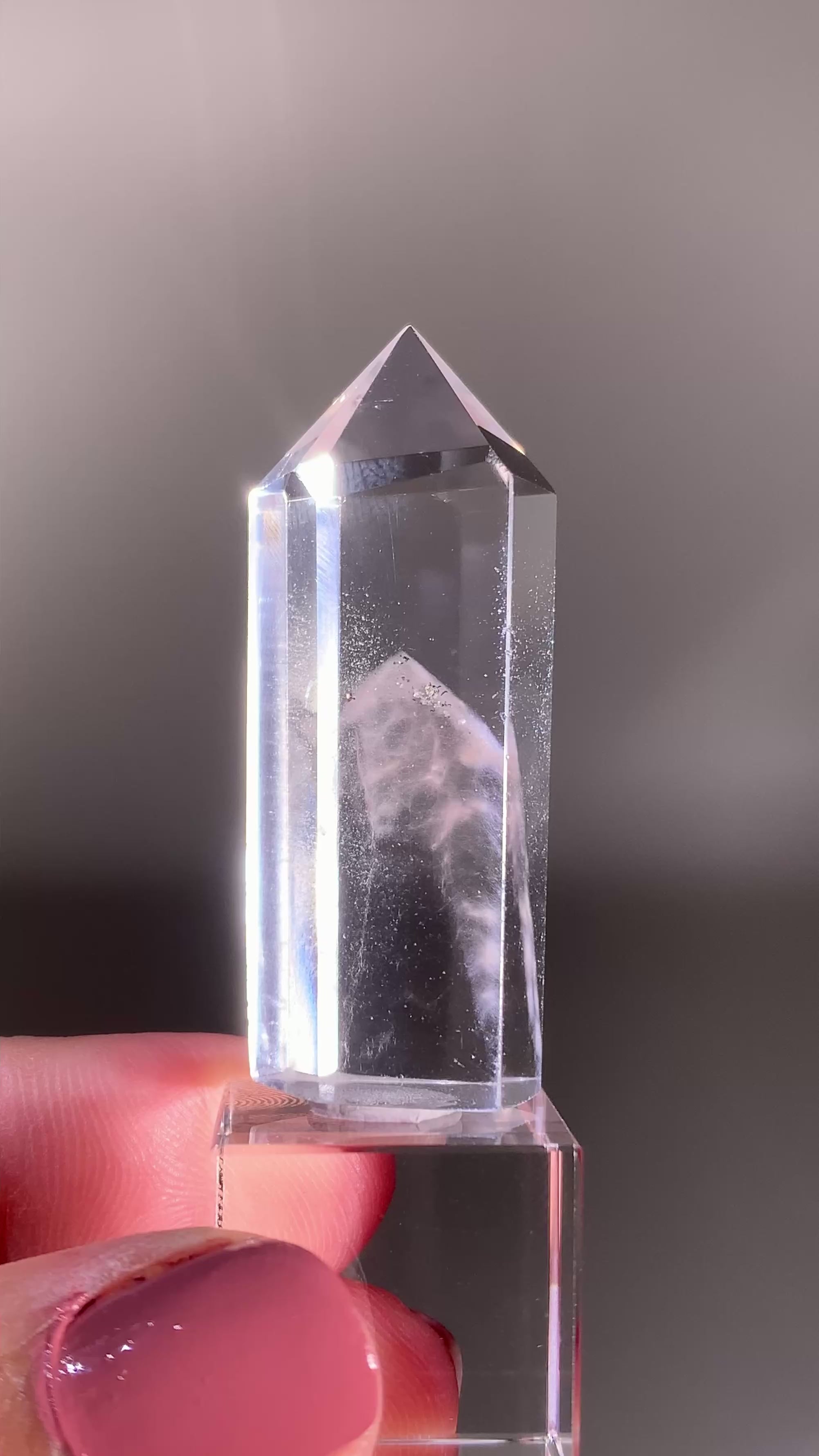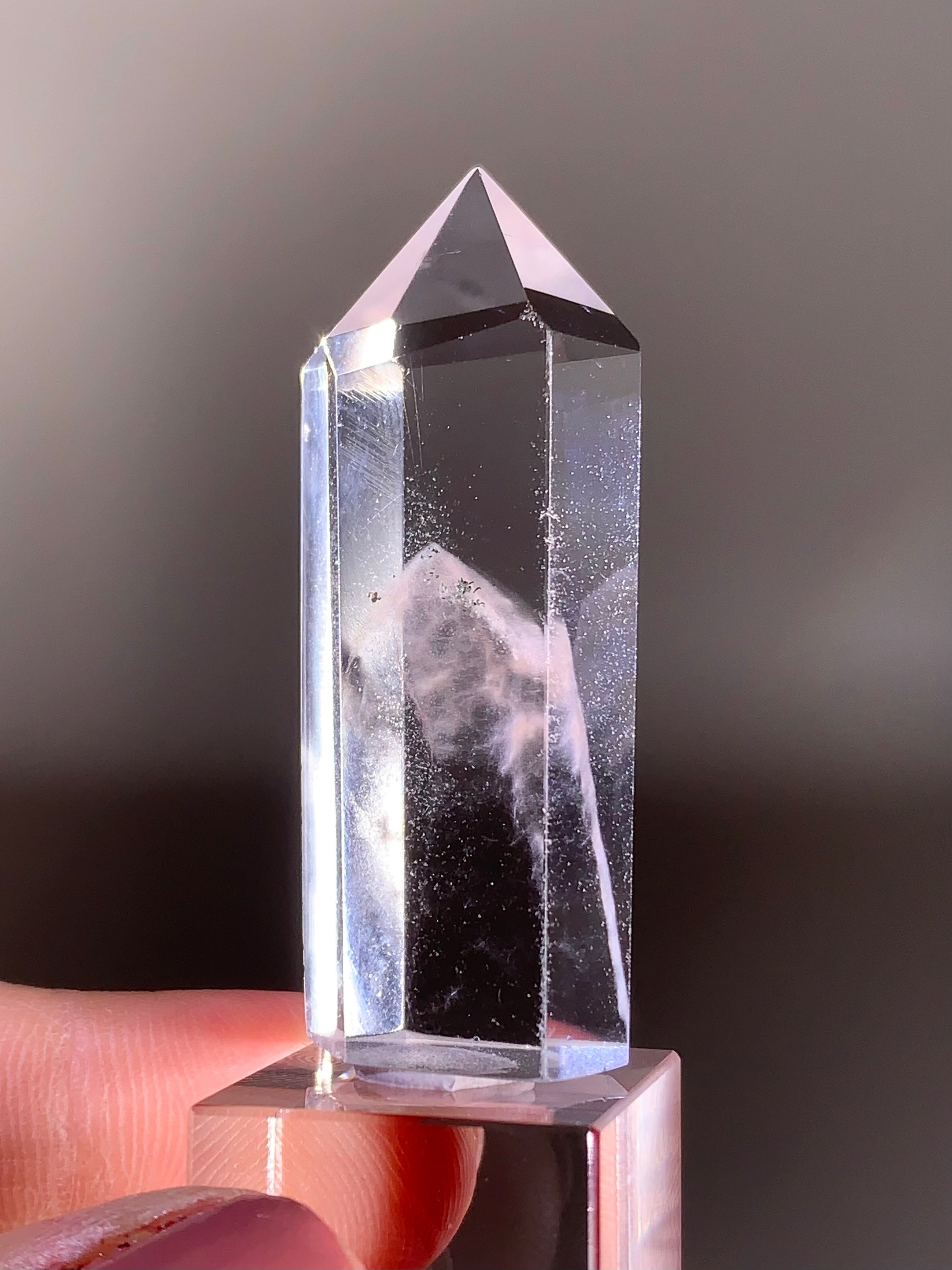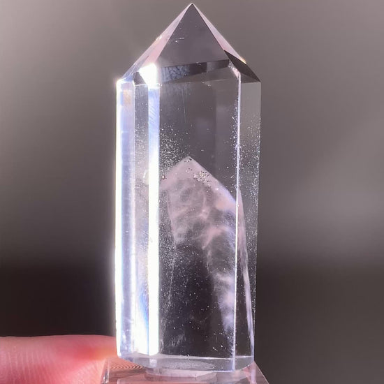 This high-quality Pink Amphibole Phantom Quartz polished tower from Madagascar showcases vibrant pink amphibole inclusions forming beautiful phantom within the crystal. The polished tower shape highlights its clarity and depth, while the internal phantoms create stunning visual interest from every angle.