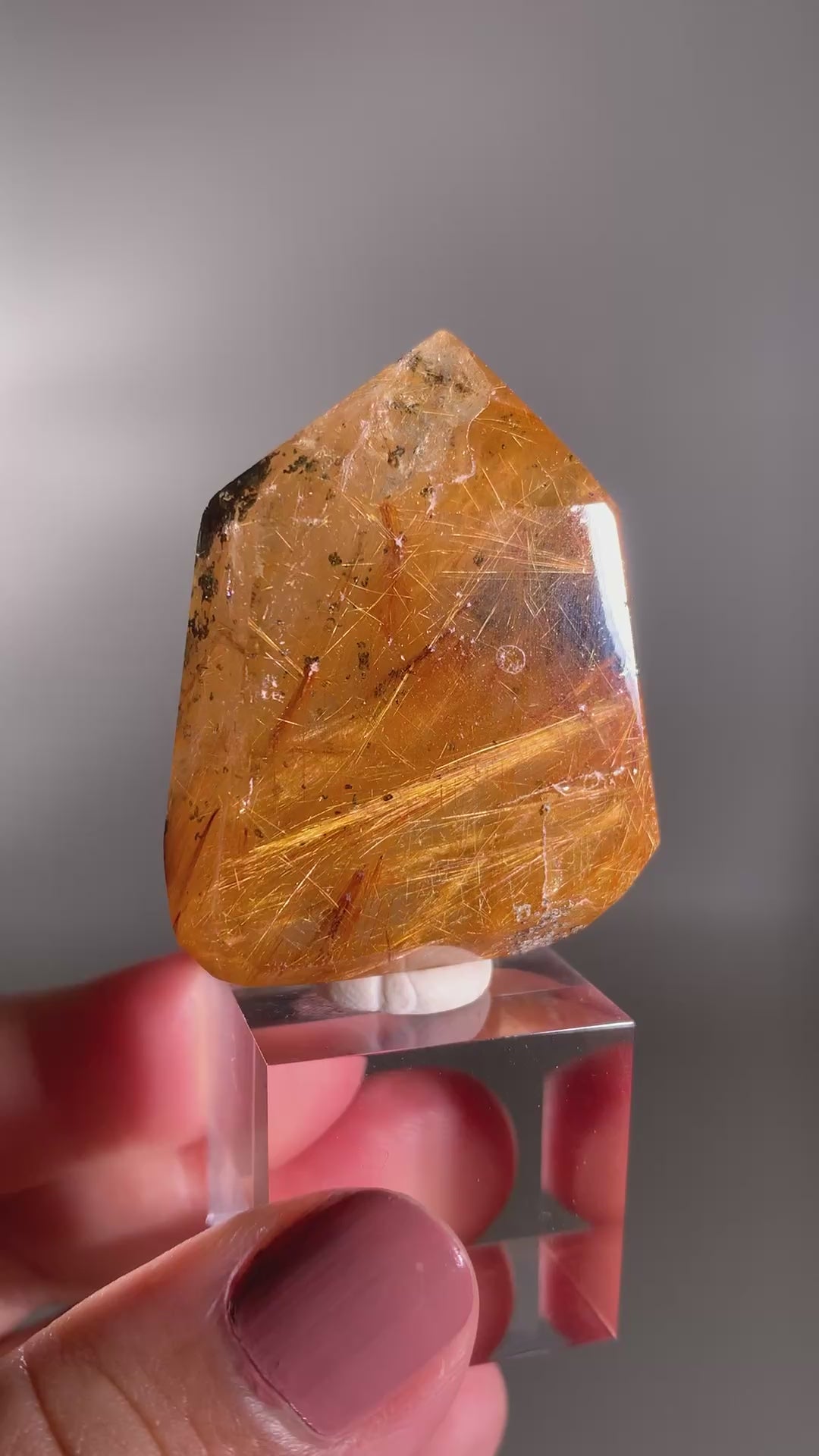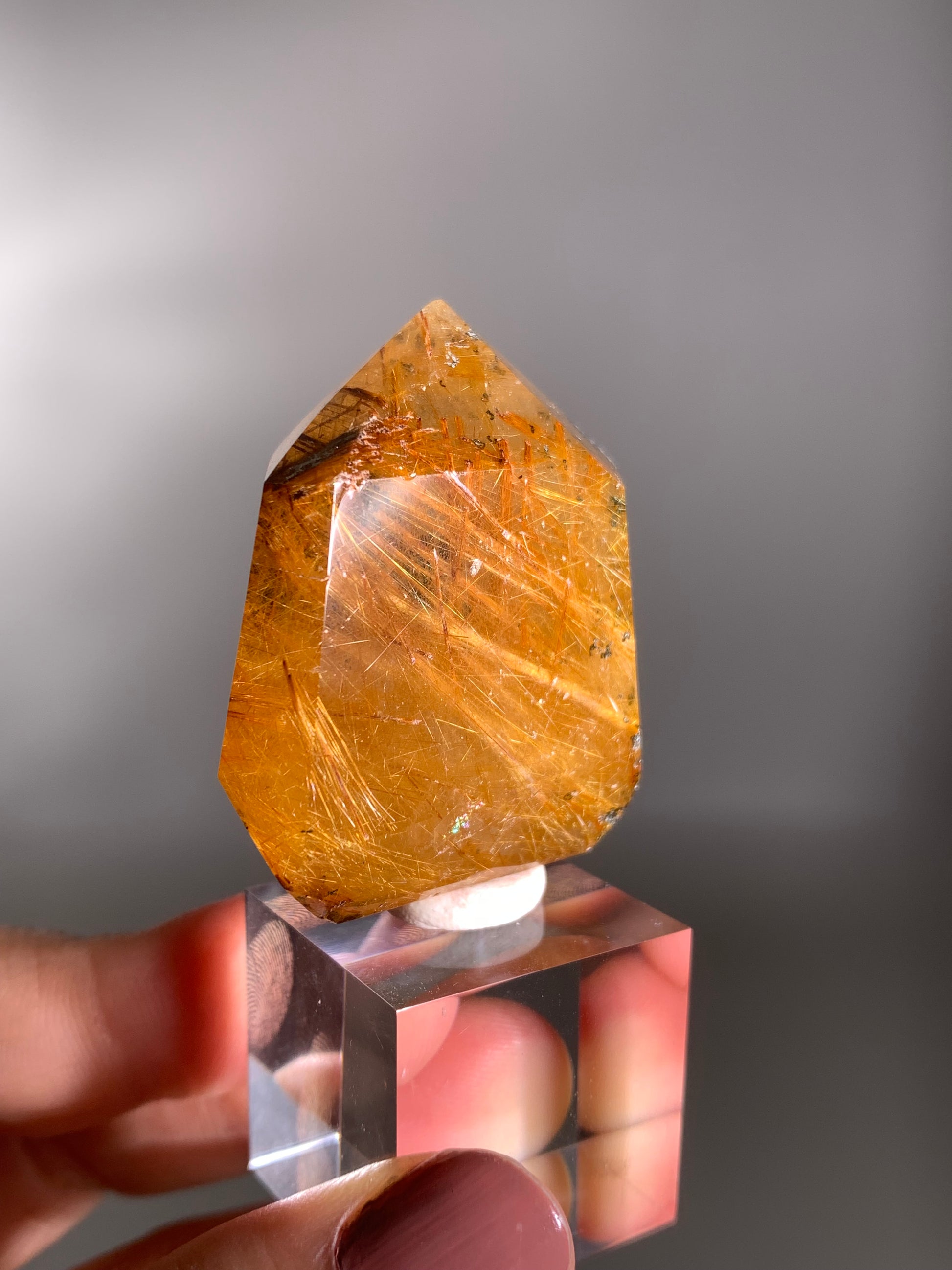 A high-quality polished tower featuring a dense concentration of radiant golden rutile needles suspended in clear quartz. The rich packing of rutile creates a luminous, almost fiery effect, making this piece a striking display of natural brilliance and mineral clarity. Perfect for collectors or energy work.