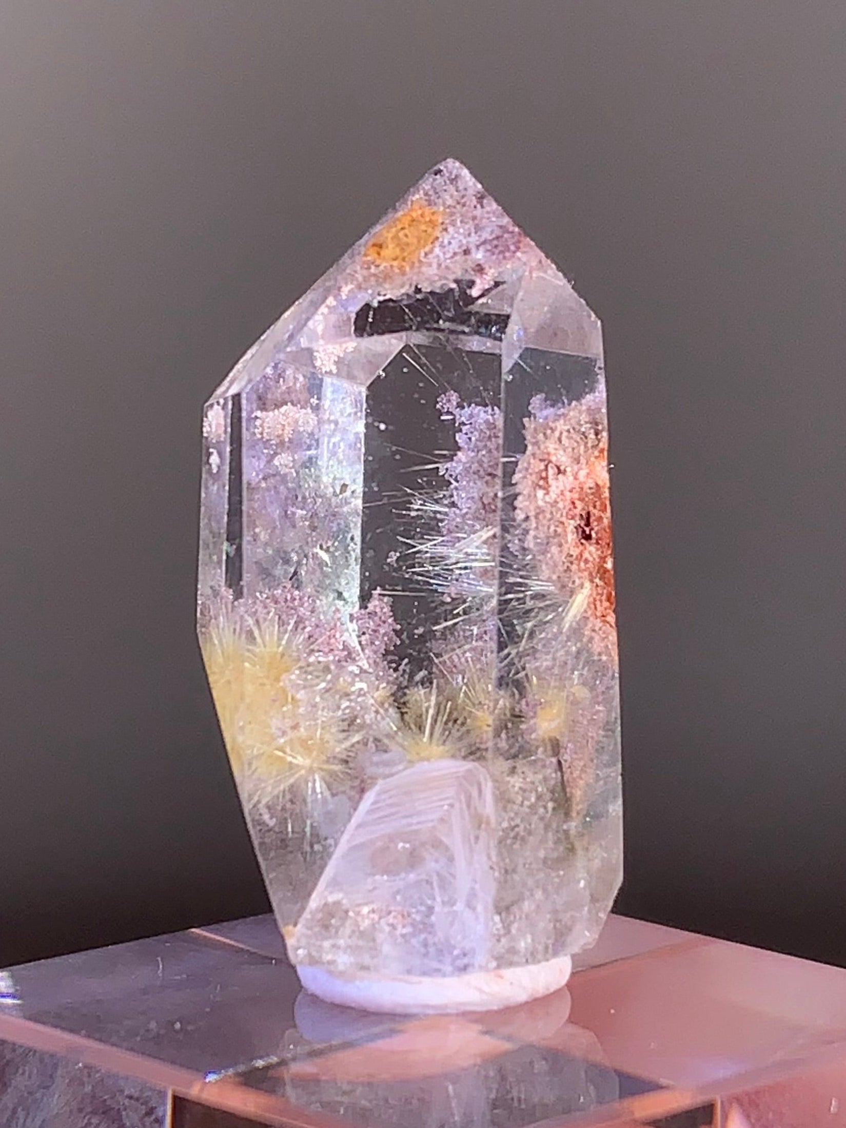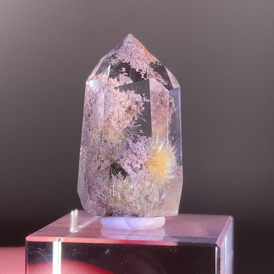This high-quality Rutile Flower Quartz polished freeform from Brazil features delicate rutile blooms paired with pink and purple garden and manifestation inclusions. The polished surface highlights its depth, color, and intricate internal scenery, making it a striking and highly collectible display piece.