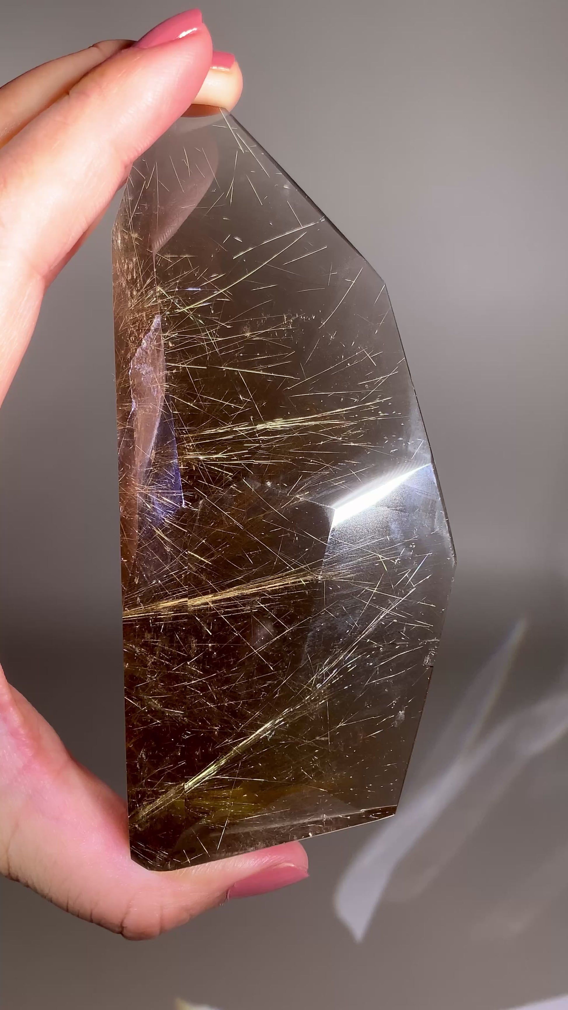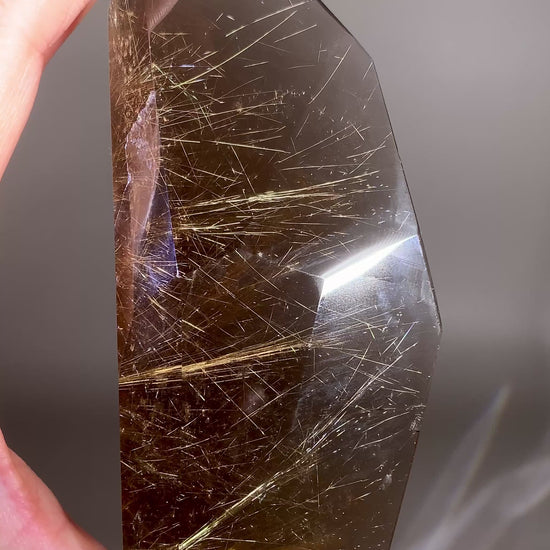 This high-quality standing freeform features a smoky quartz body illuminated by a rare shooting star rutile inclusion streaking across the interior. Polished to a smooth, glossy finish, it stands beautifully on its own, making it perfect for display. The natural smoky tones add depth and warmth, while the golden rutile “star trail” creates a dynamic, celestial effect unique to this piece. Ethically sourced from Brazil, this freeform is a captivating blend of clarity, movement, and natural artistry.