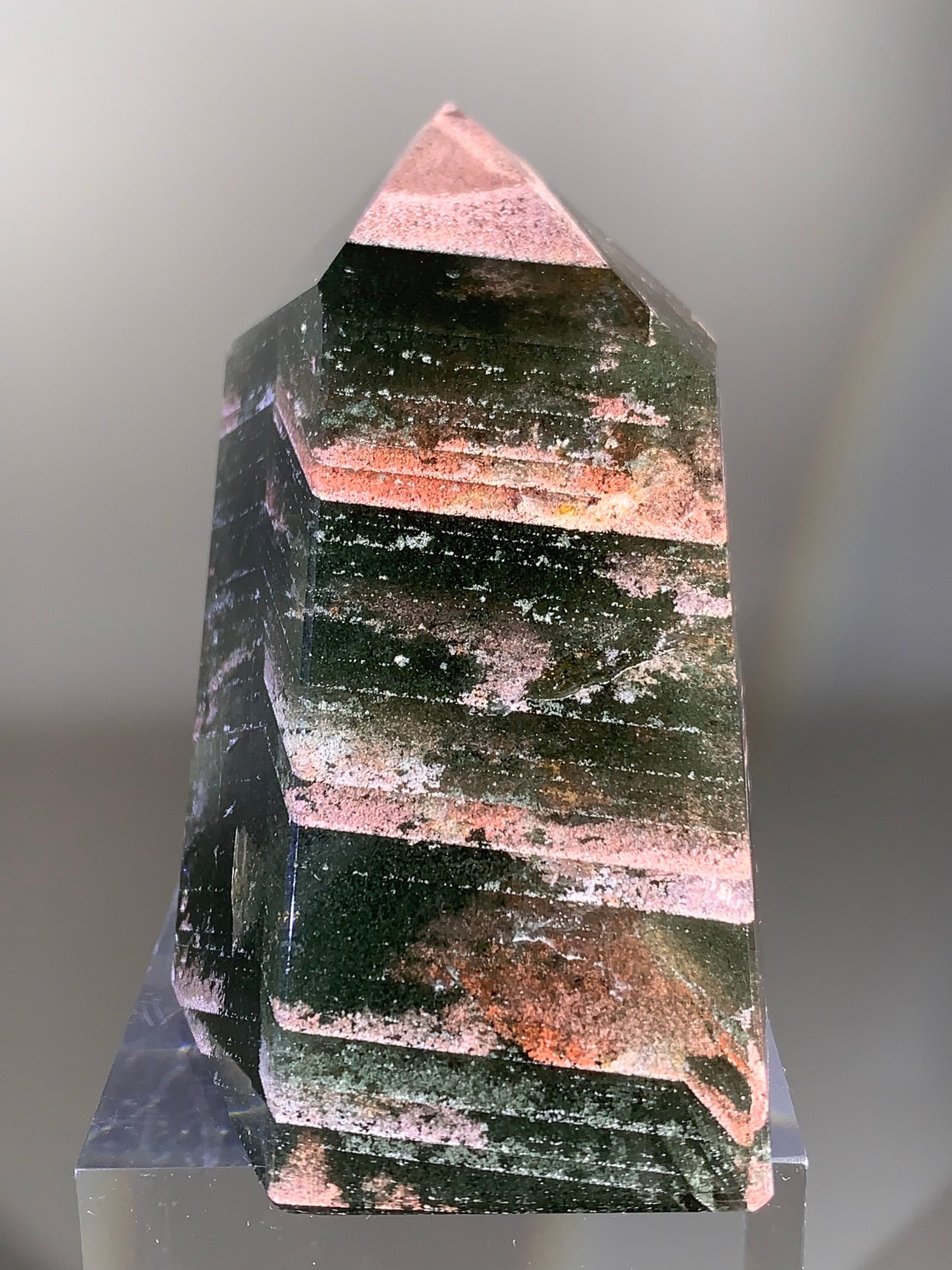 Large Pink Lodolite & Green Chlorite Layered Garden Quartz Polished Tower from Brazil