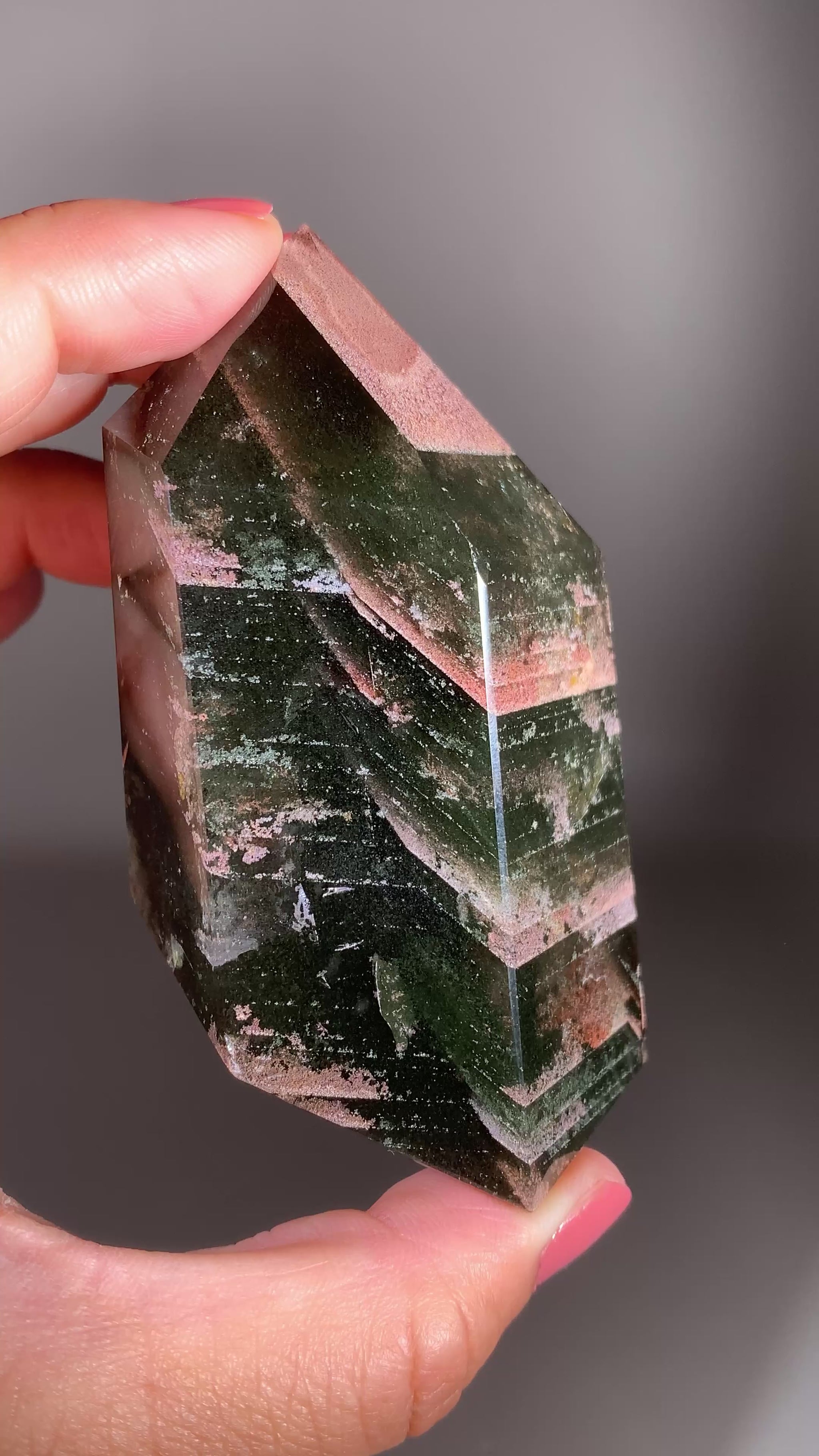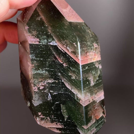 Large polished Garden Quartz tower from Brazil featuring beautiful layers of pink lodolite and green chlorite inclusions. This natural crystal showcases rich internal landscapes and unique mineral formations, making it a stunning collector piece.