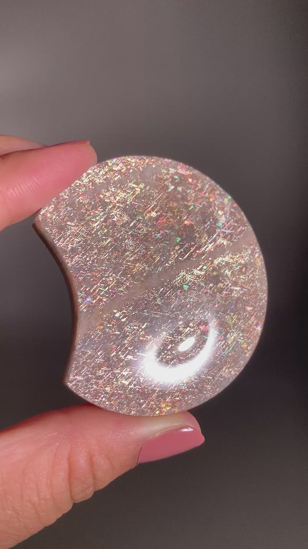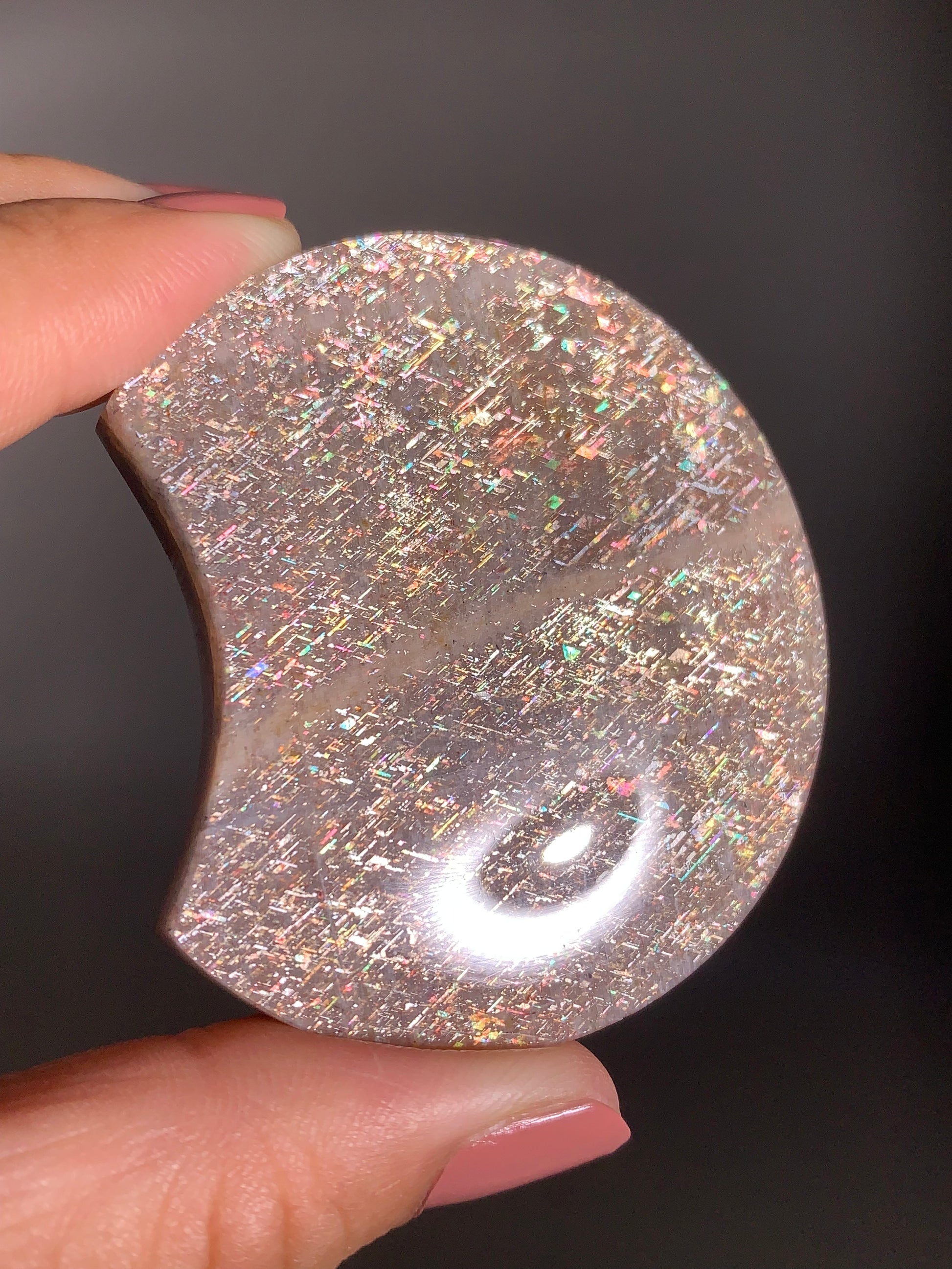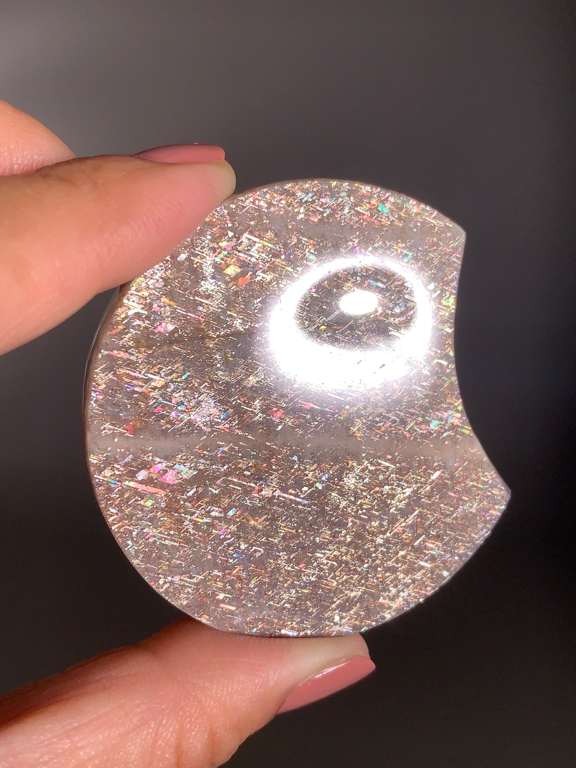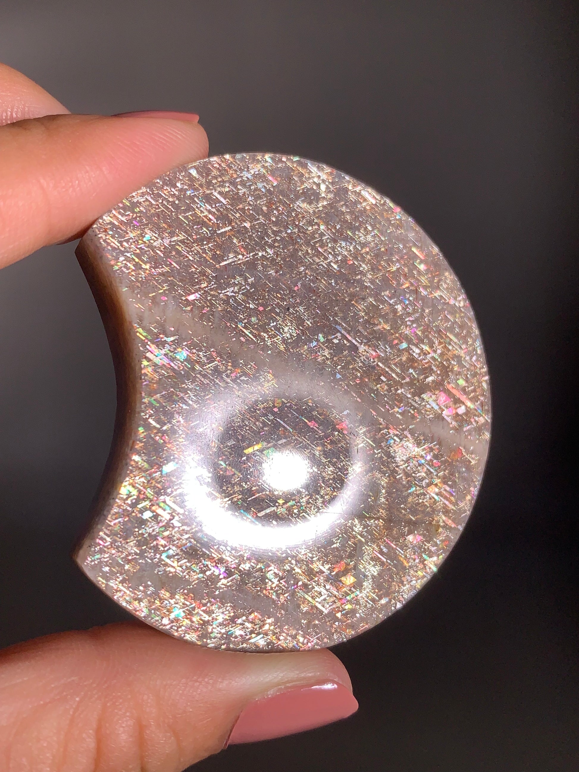 Rainbow Lattice Sunstone from Tanzania is a rare gem with sparkling lattice patterns and flashes of rainbow color — a natural stunner, beautifully polished into a unique moon shape.