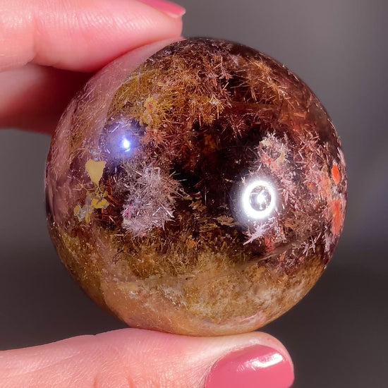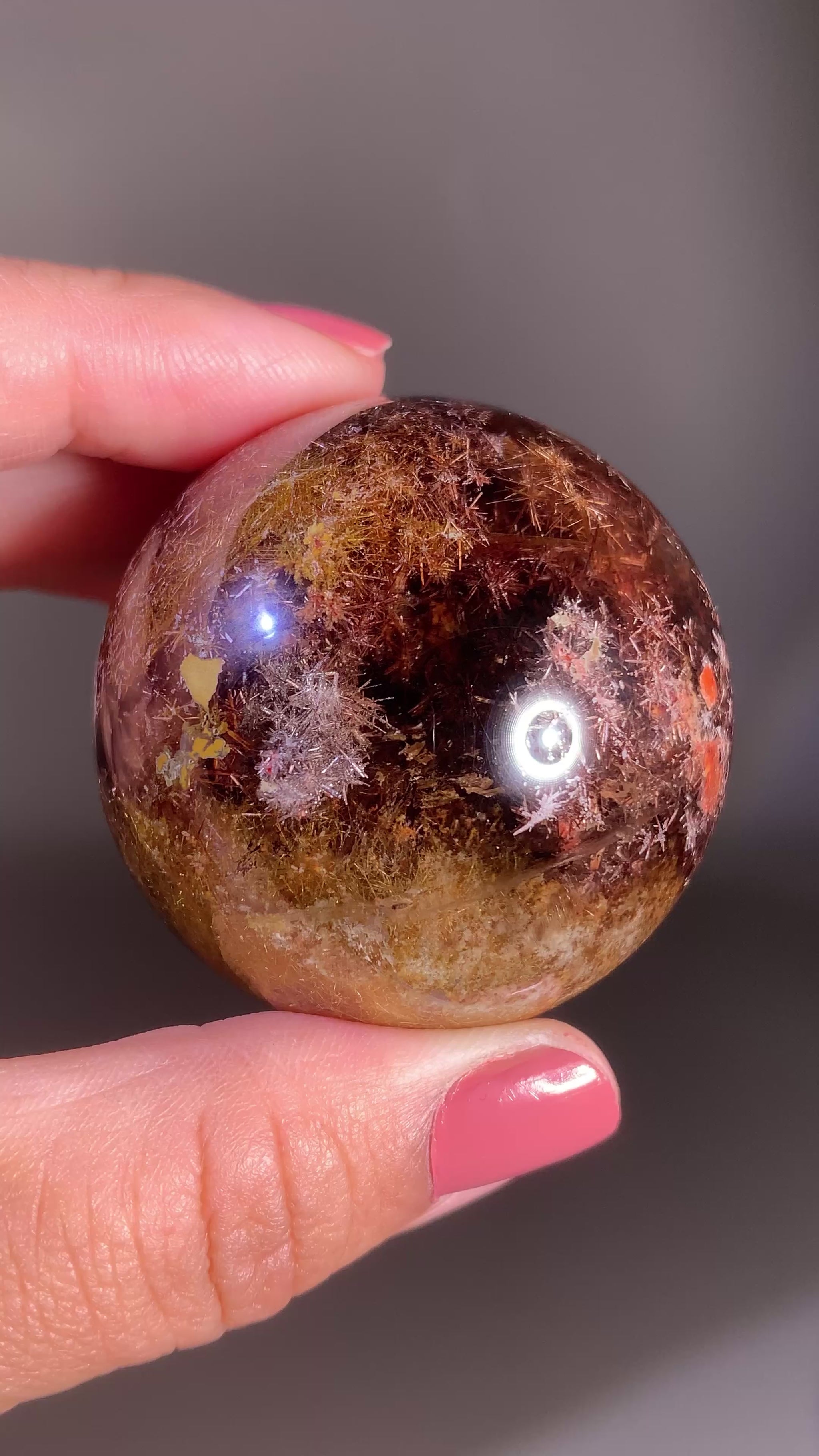 This large festive Brazilian Rutile Quartz sphere is richly packed with vibrant silver, gold, and copper starburst needles. Its dense, radiant inclusions create incredible depth and shimmer from every angle, making it a standout collector’s piece and a striking addition to any display.