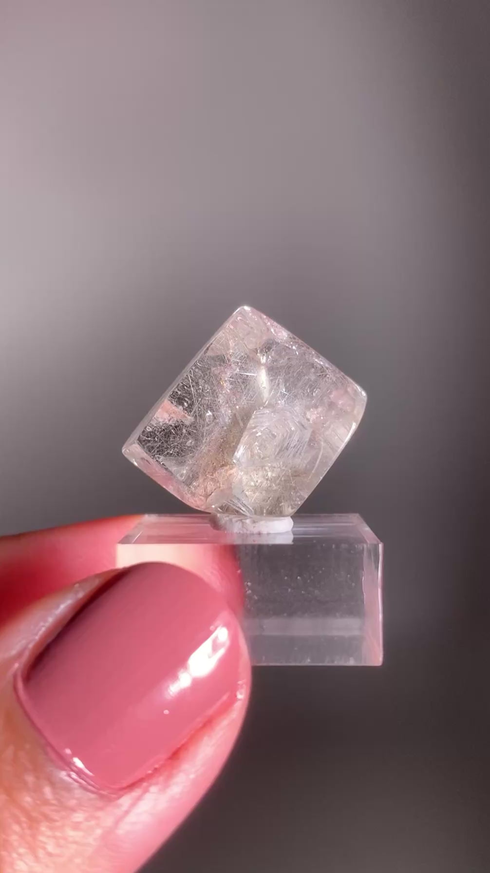 An exceptional polished crystal from Madagascar showcasing shimmering champagne-gold rutile needles encased within quartz-in-quartz formations, accented by delicate pink lodolite inclusions. This rare combination radiates elegance and amplifies clarity, love, and grounding energy—perfect for collectors seeking a one-of-a-kind treasure.