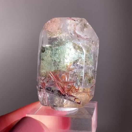 A exquisite polished crystal featuring vibrant red copper rutile needles intertwined with sparkling mica inclusions. This rare combination enhances grounding energy, vitality, and confidence, while adding a beautiful metallic shimmer to your collection.
