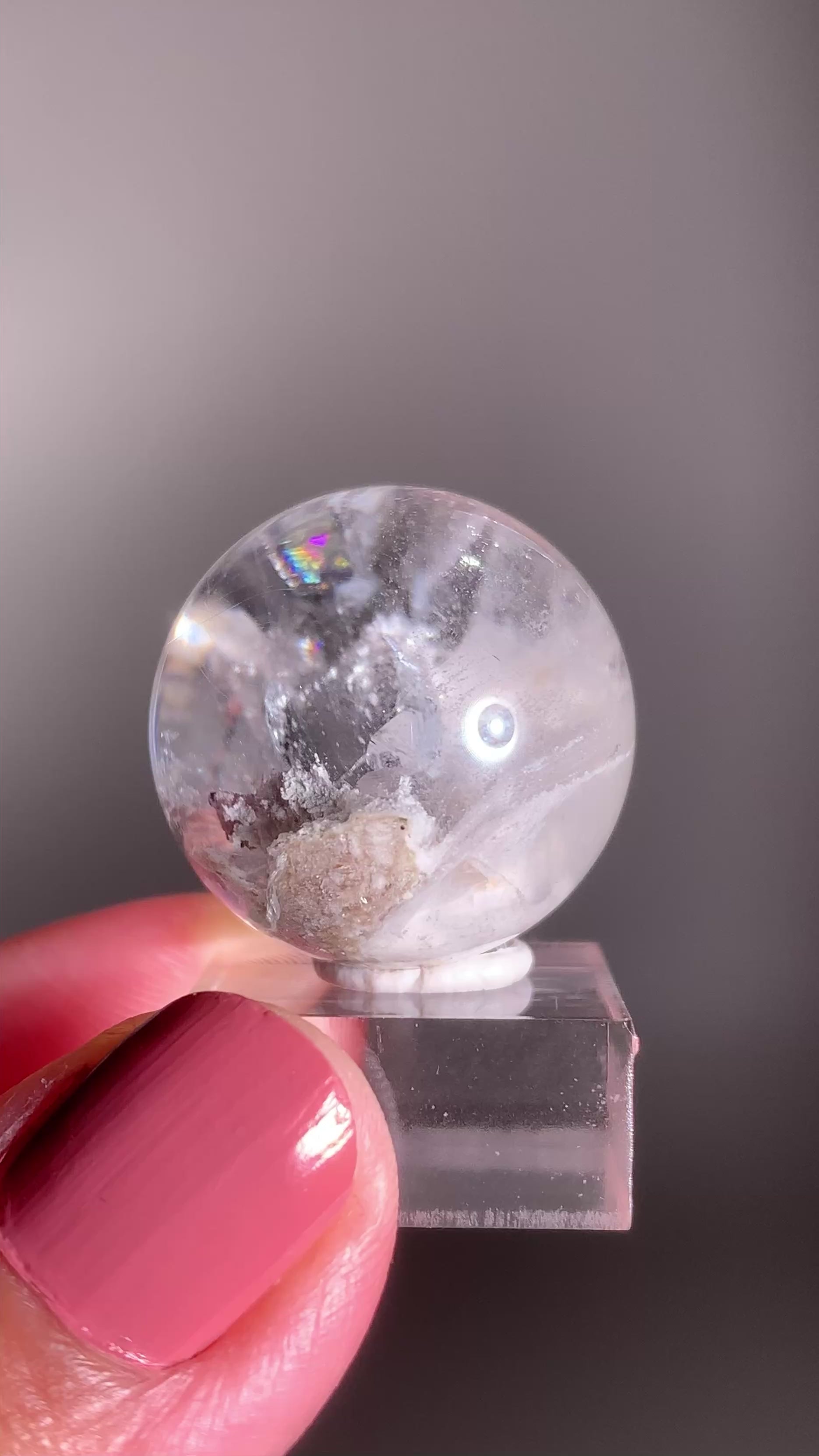 A clear quartz sphere featuring a rare manifestation (quartz within quartz). Inside the sphere, you can see the internal crystal patterns formed naturally as the quartz grew, creating intricate and captivating formations. This unique crystal-in-crystal structure adds depth, beauty, and a one-of-a-kind character, making it an exceptional collector’s piece.