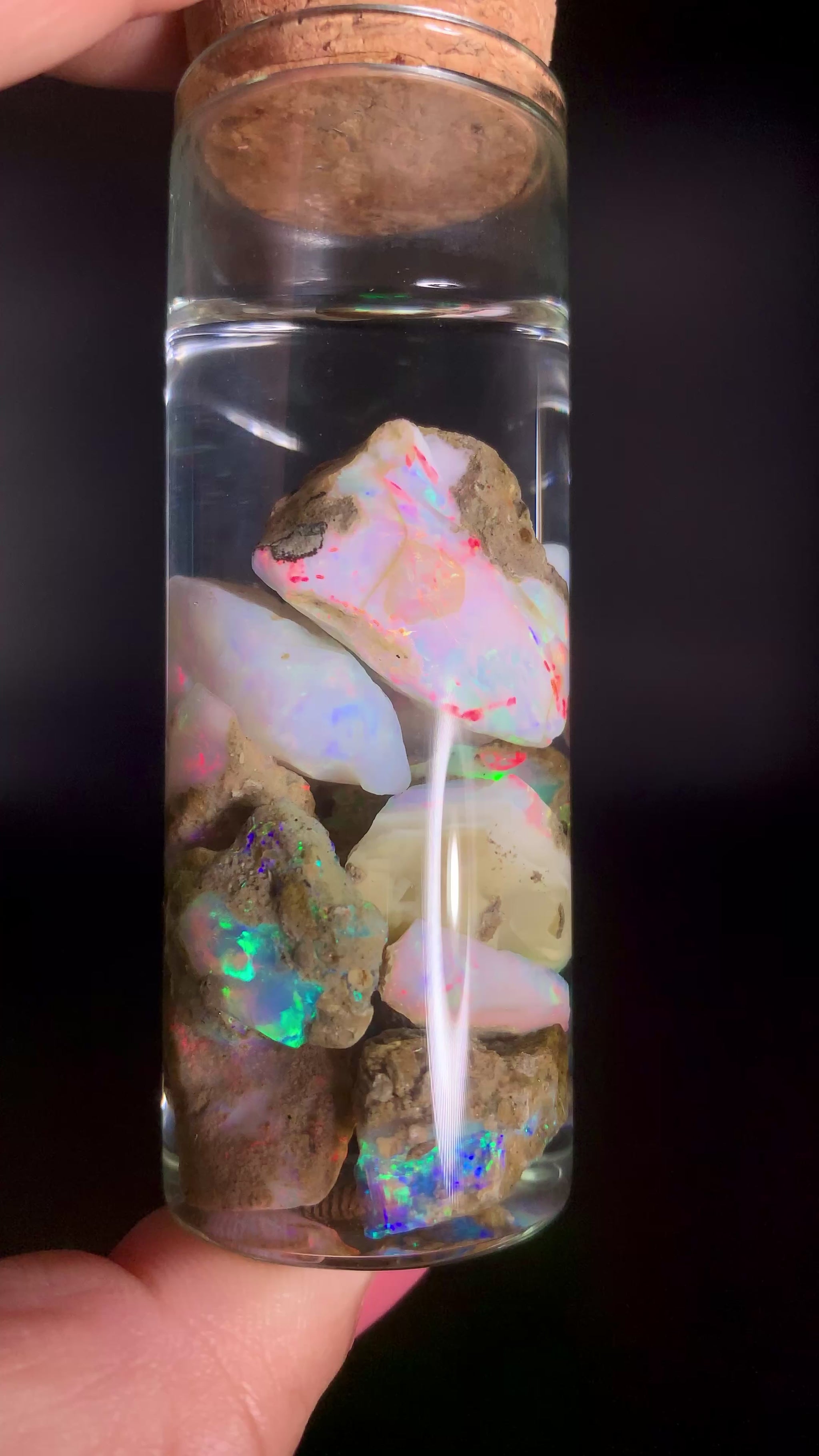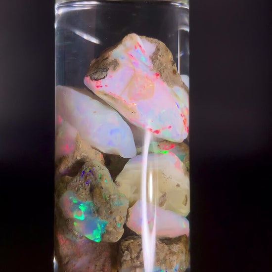 This Chalk Opal specimen from Wello, Ethiopia is a variety of low-moisture opal known for its unique properties. It features a bright white to pale blue base with dense, vibrant flashes of color across the surface. Chalk opals can be kept either wet or dry; however, when dried they may lose density and become more fragile. For this reason, we recommend choosing one consistent storage method to help reduce the risk of damage.