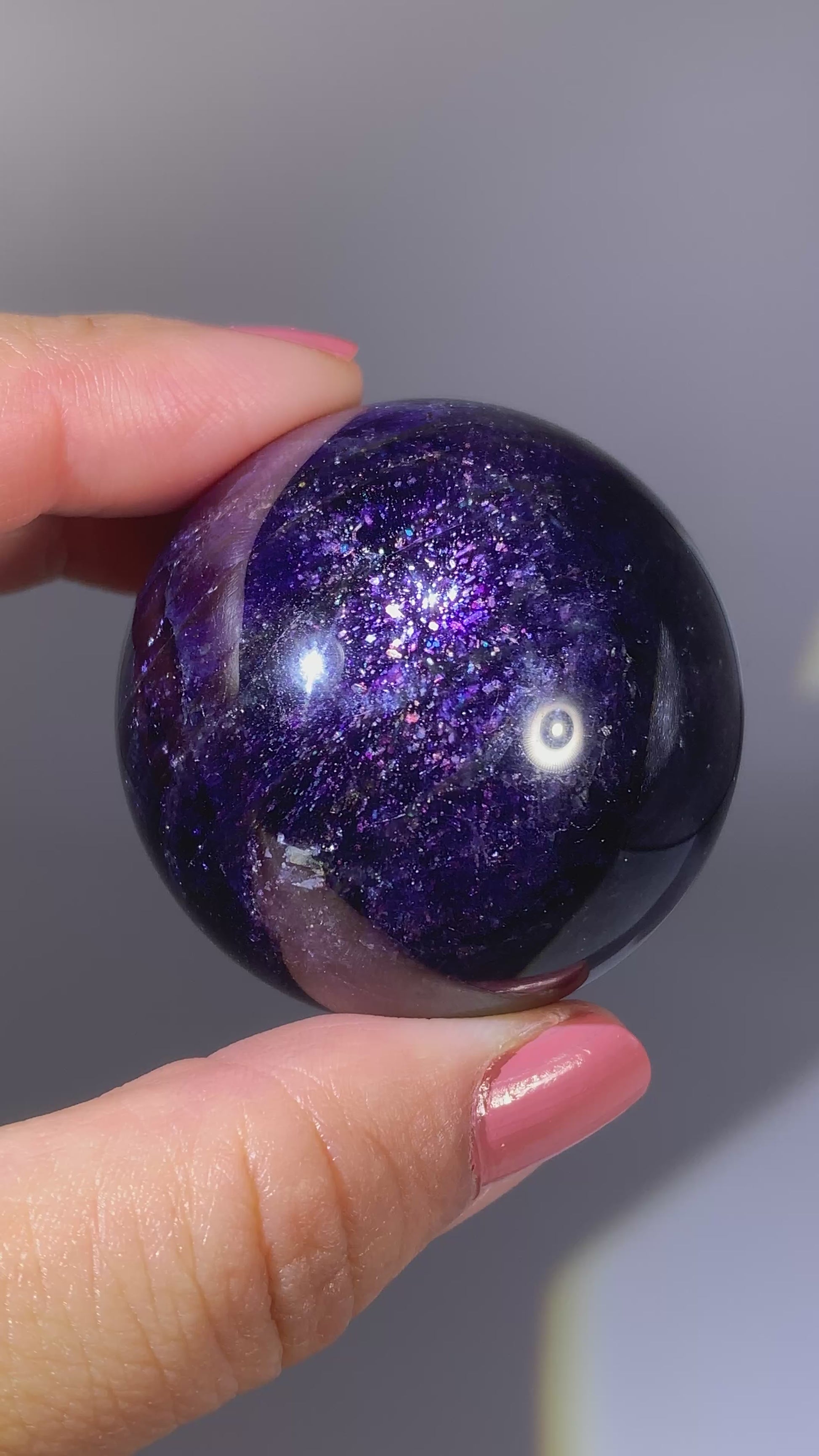 Natural high-grade Galaxy Iolite and Sunstone bloodshot sphere from Tanzania. Rare and collectible, this polished gem crystal sphere showcases stunning color and internal shimmer, perfect for display or serious collectors.