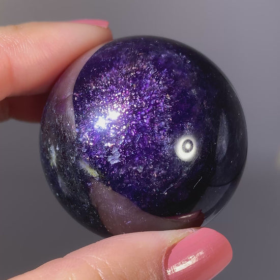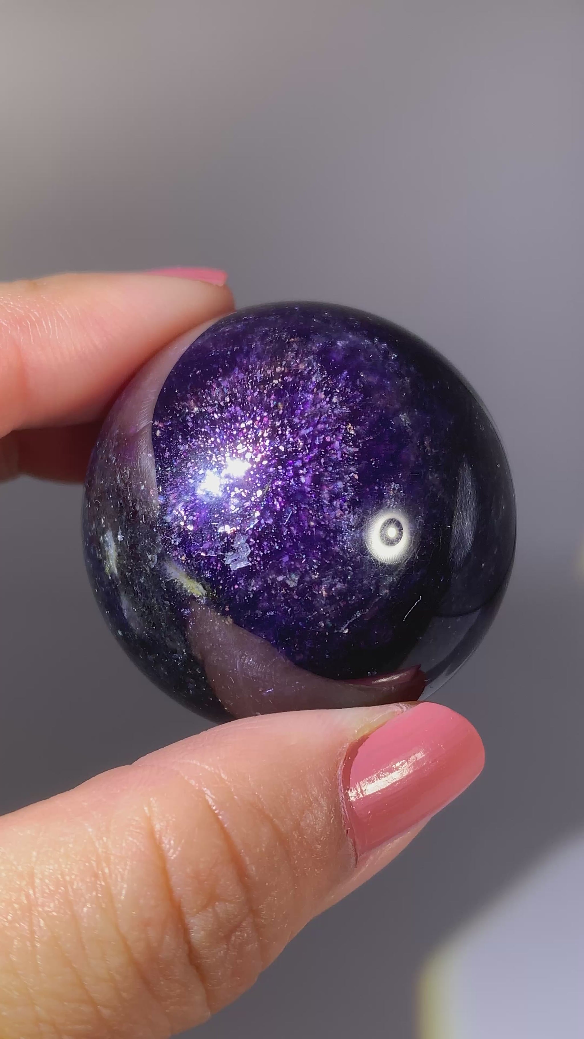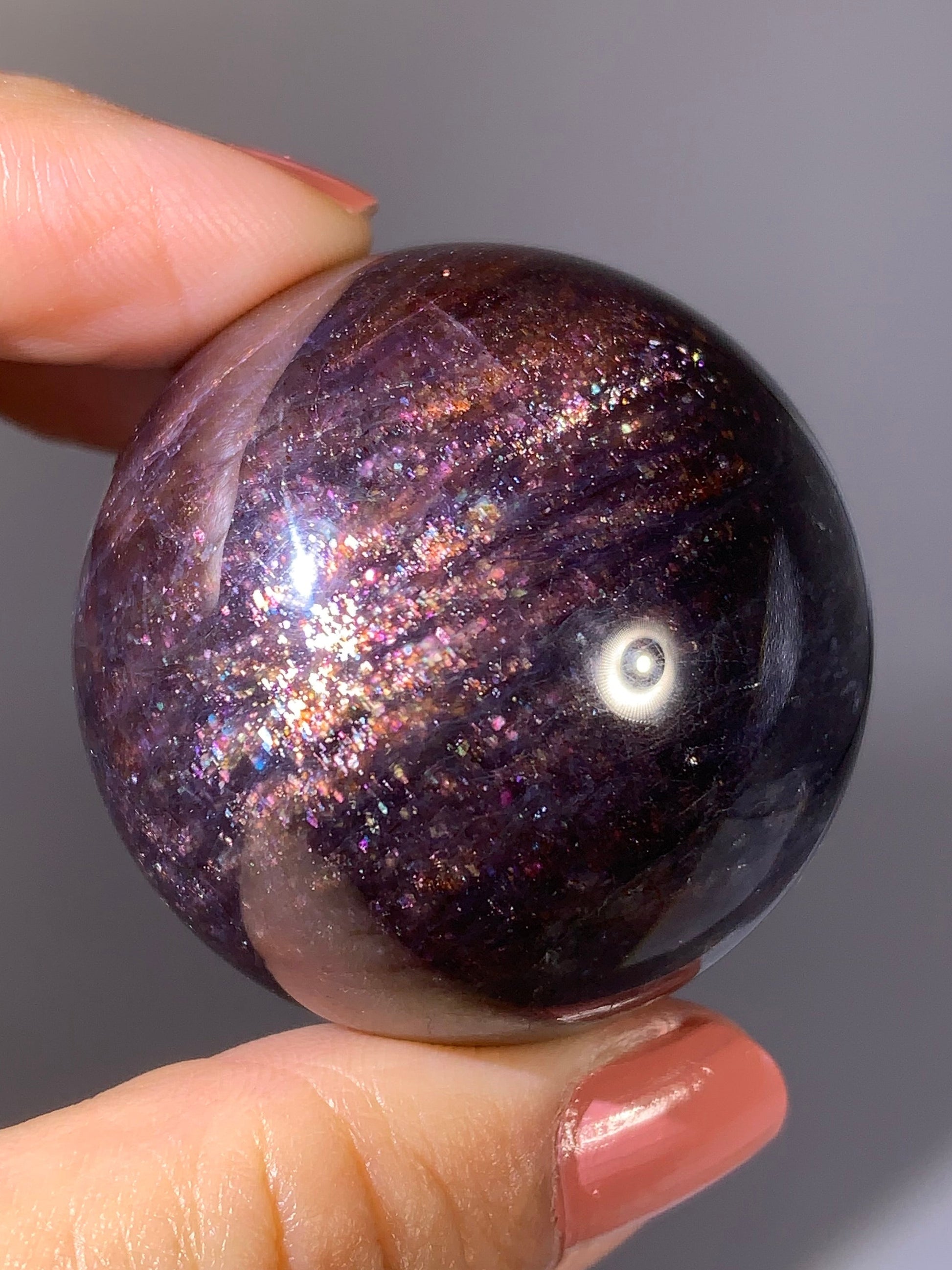 Natural high-grade Galaxy Iolite and Sunstone bloodshot sphere from Tanzania. Rare and collectible, this polished gem crystal sphere showcases stunning color and internal shimmer, perfect for display or serious collectors.