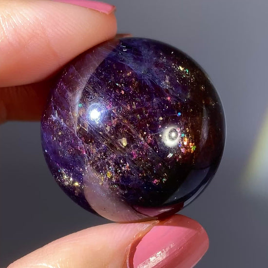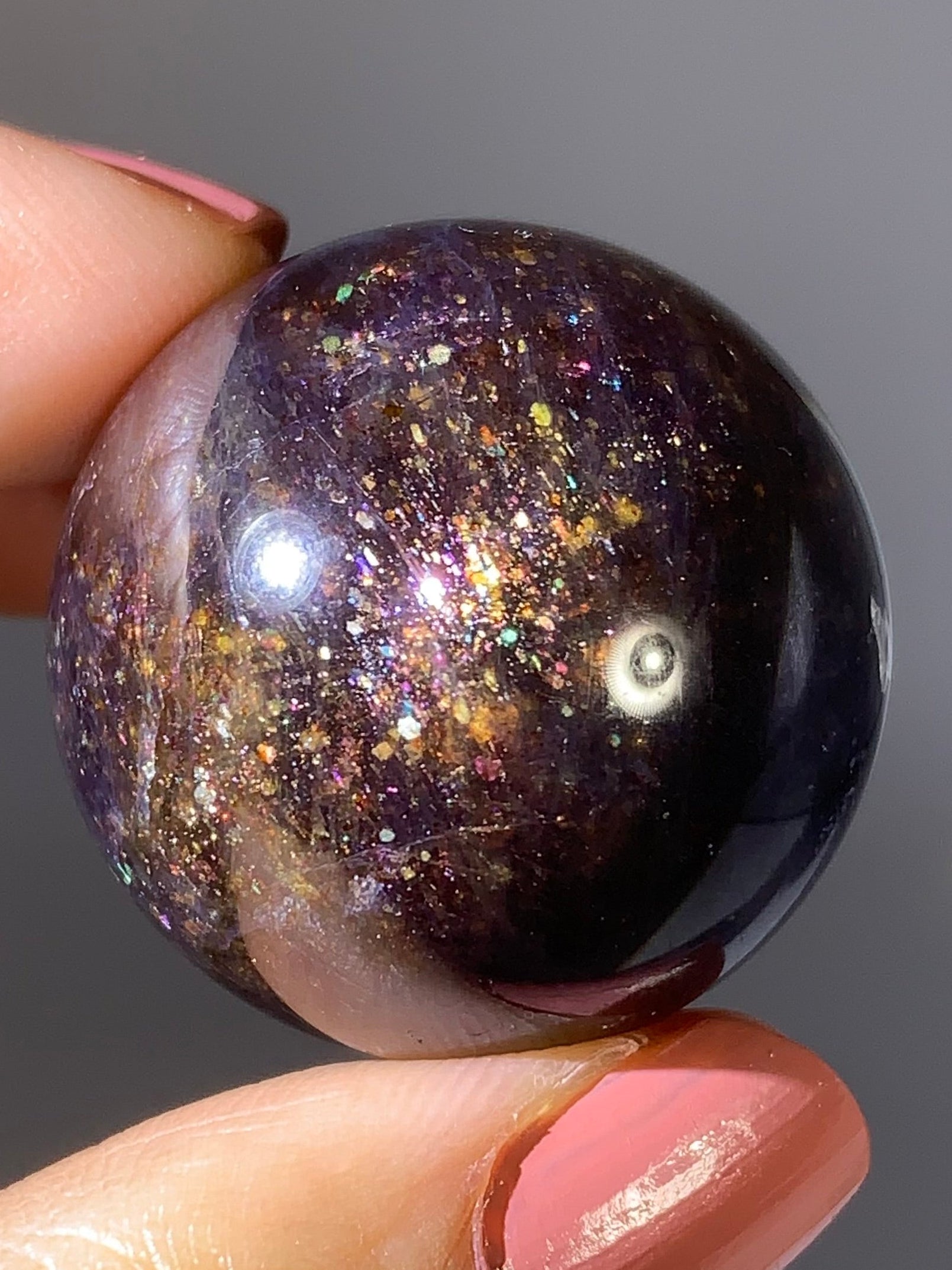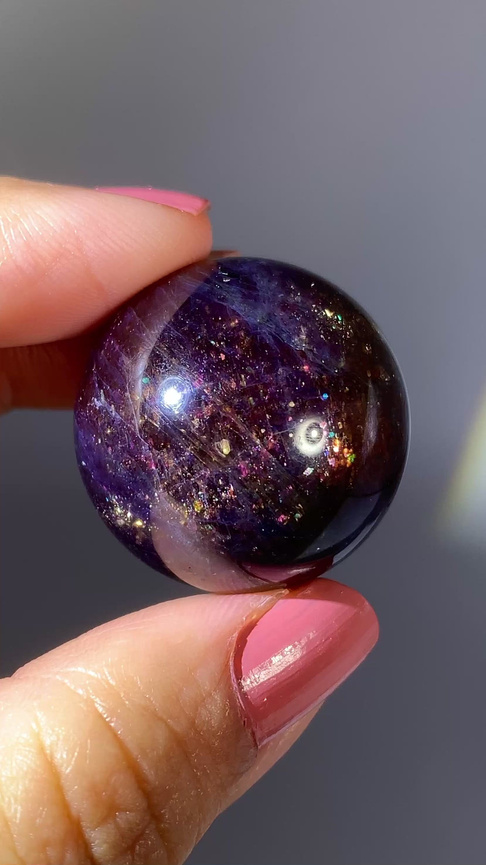 Natural high-grade Galaxy Iolite and Sunstone bloodshot sphere from Tanzania. Rare and collectible, this polished gem crystal sphere showcases stunning color and internal shimmer, perfect for display or serious collectors.
