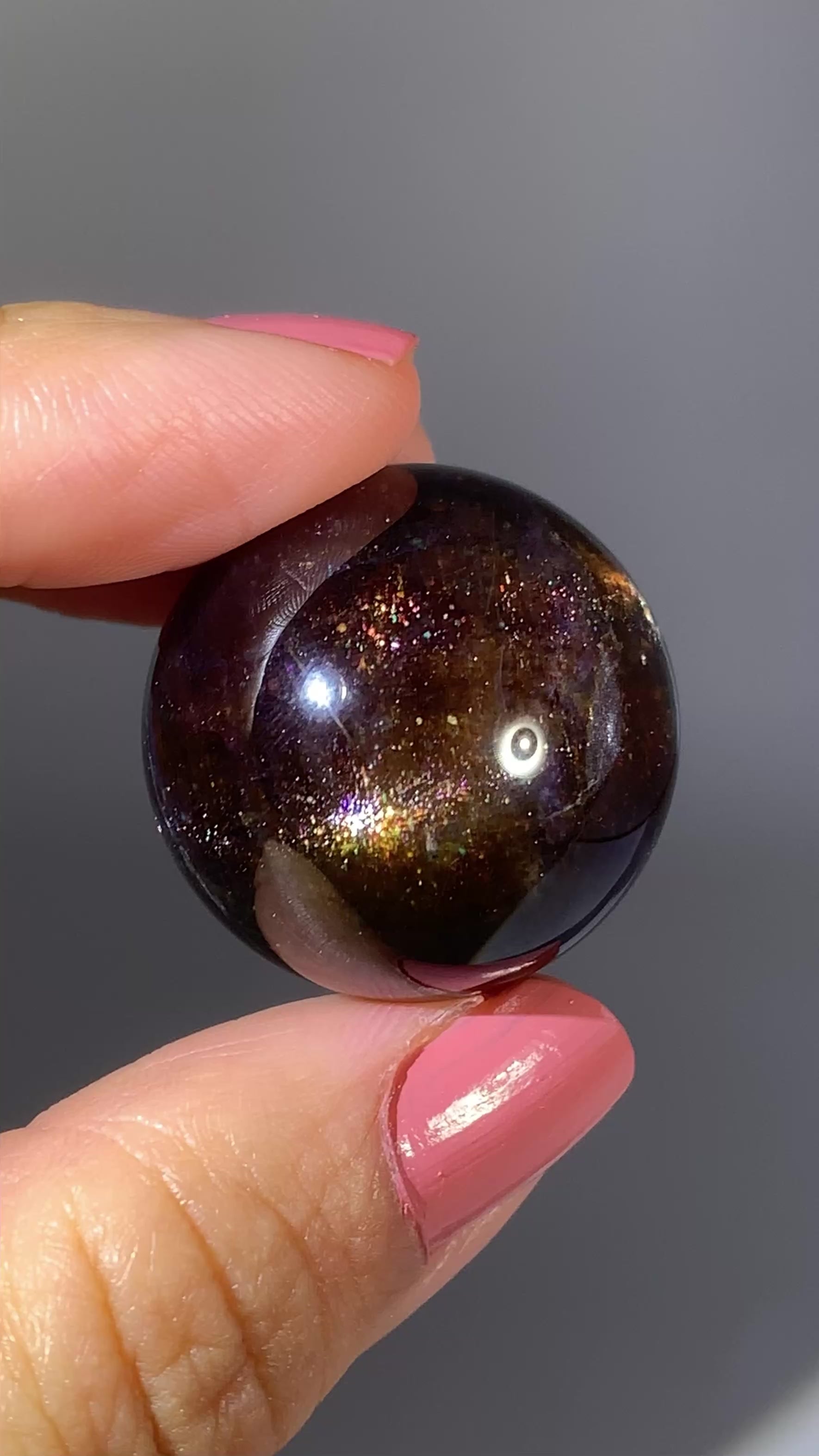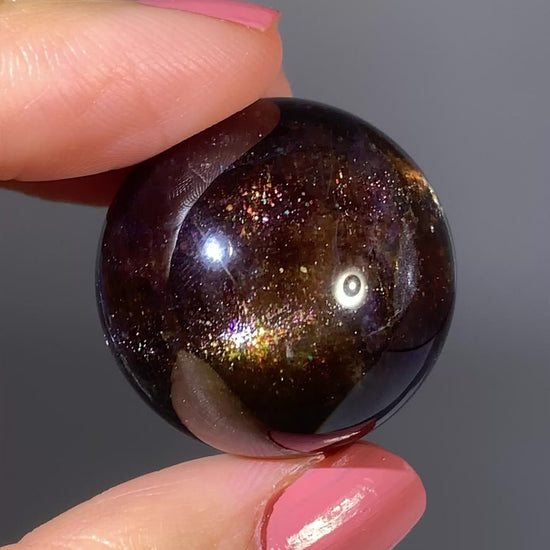 Natural high-grade Galaxy Iolite and Sunstone bloodshot sphere from Tanzania. Rare and collectible, this polished gem crystal sphere showcases stunning color and internal shimmer, perfect for display or serious collectors.