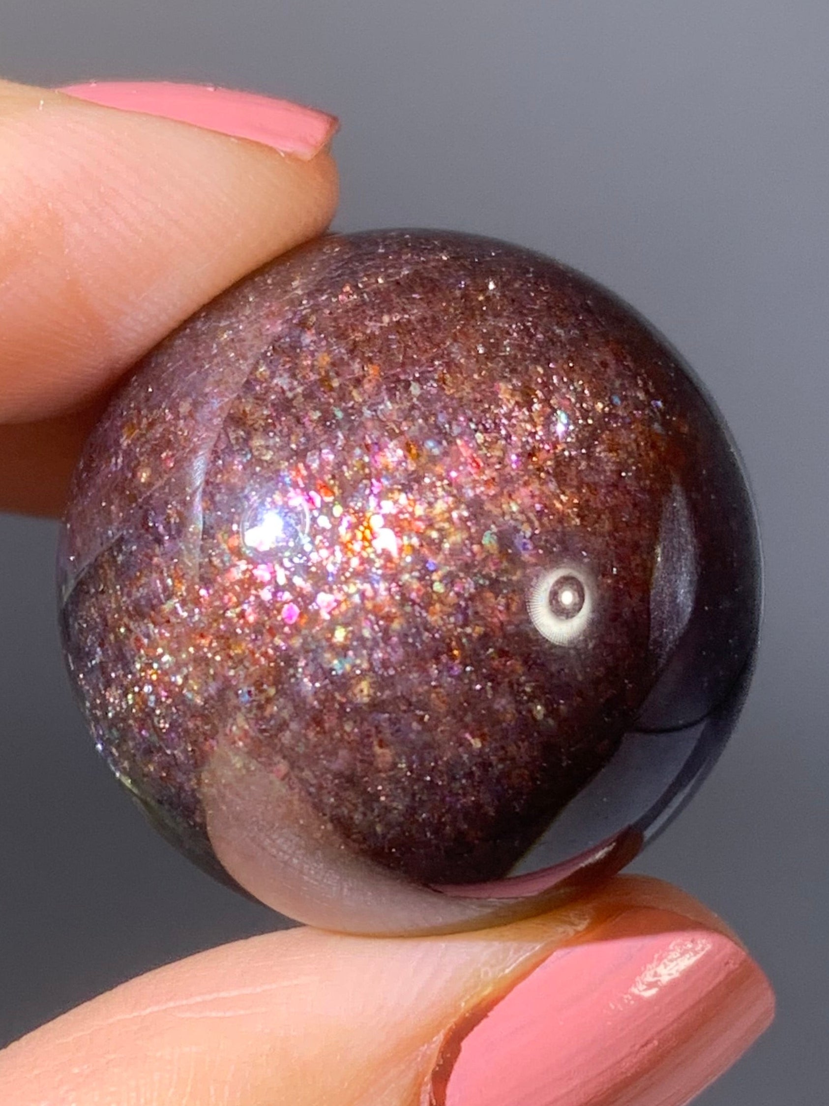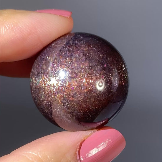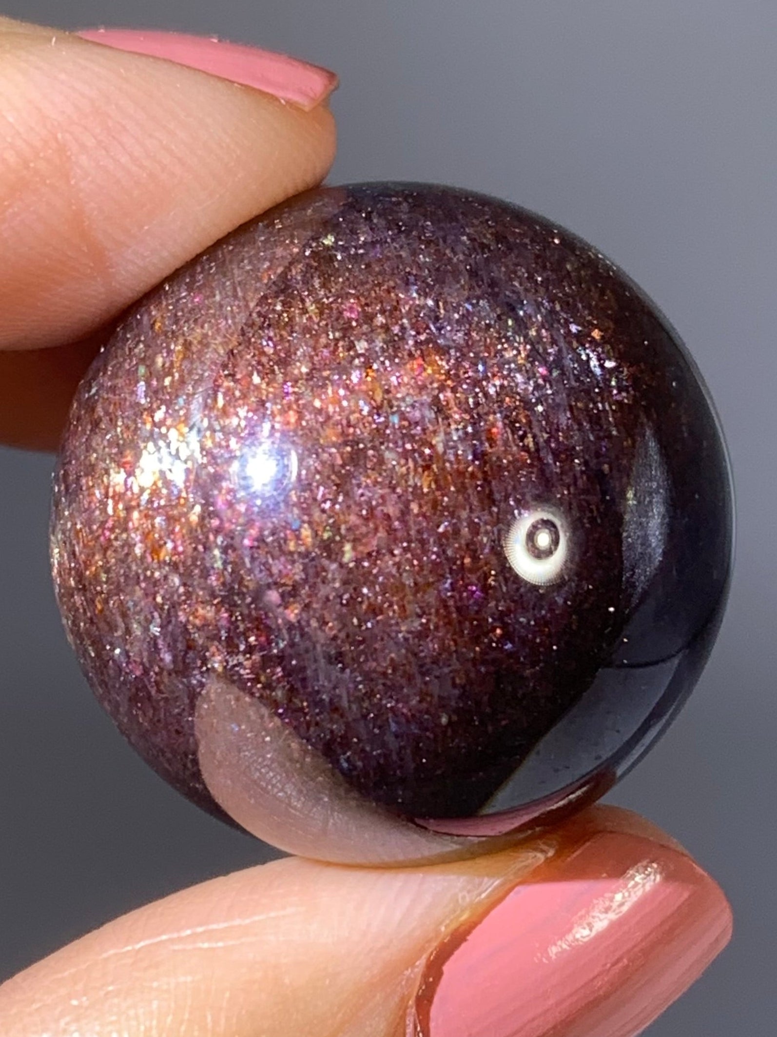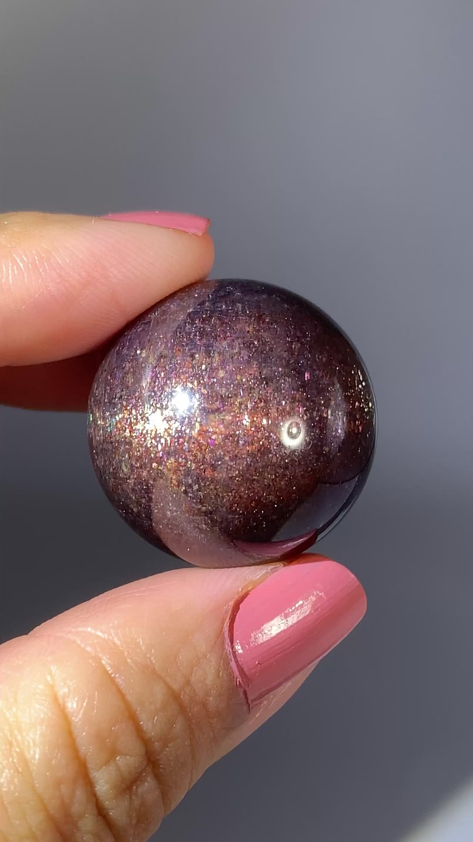 Natural high-grade Galaxy Iolite and Sunstone bloodshot sphere from Tanzania. Rare and collectible, this polished gem crystal sphere showcases stunning color and internal shimmer, perfect for display or serious collectors.
