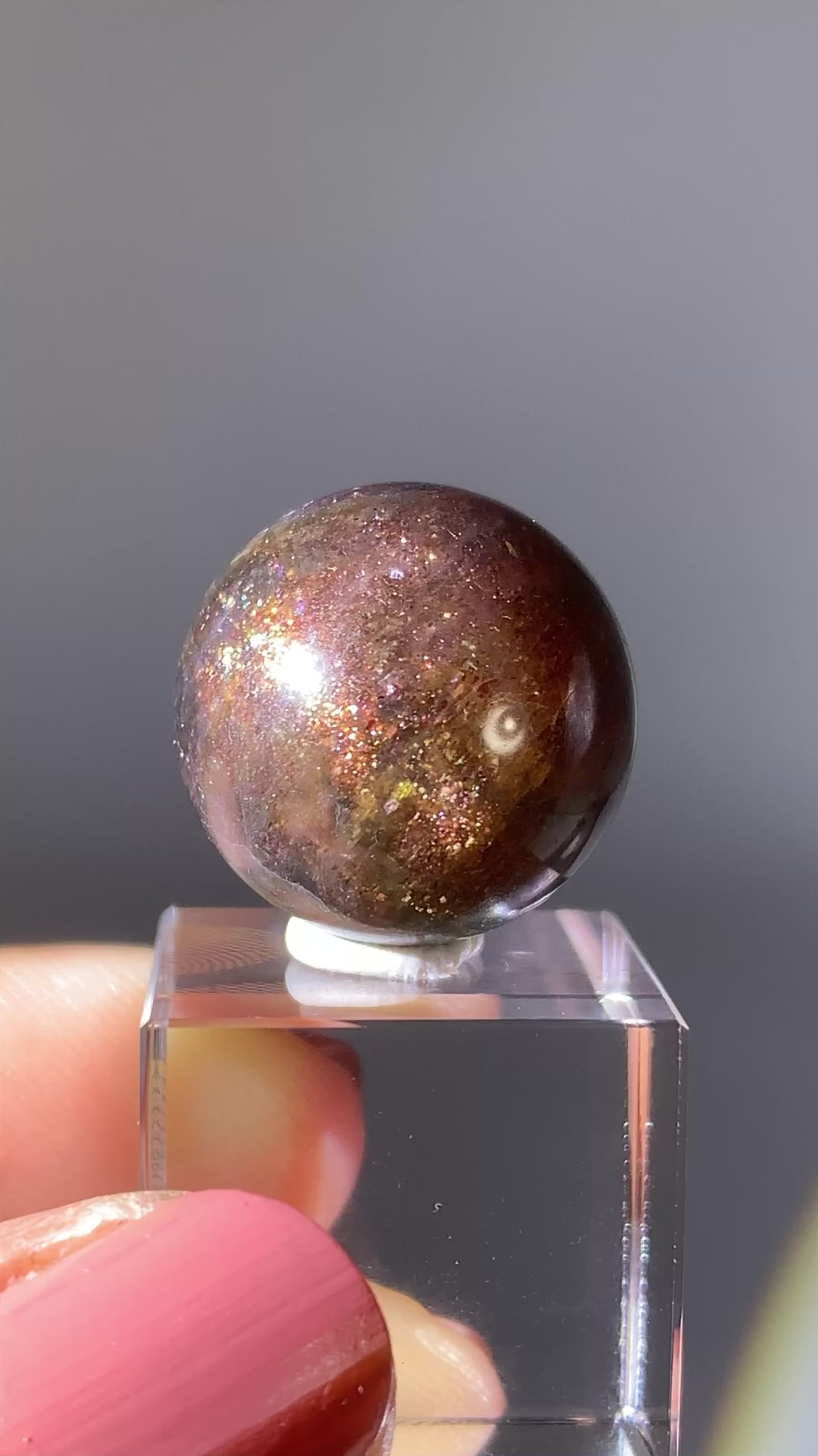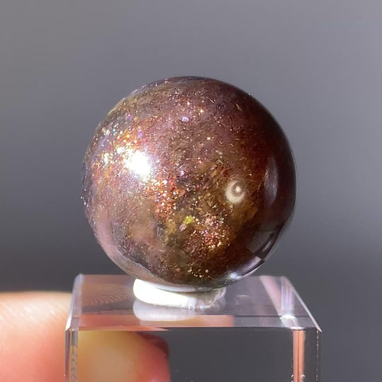 Natural high-grade Galaxy Iolite and Sunstone bloodshot sphere from Tanzania. Rare and collectible, this polished gem crystal sphere showcases stunning color and internal shimmer, perfect for display or serious collectors.