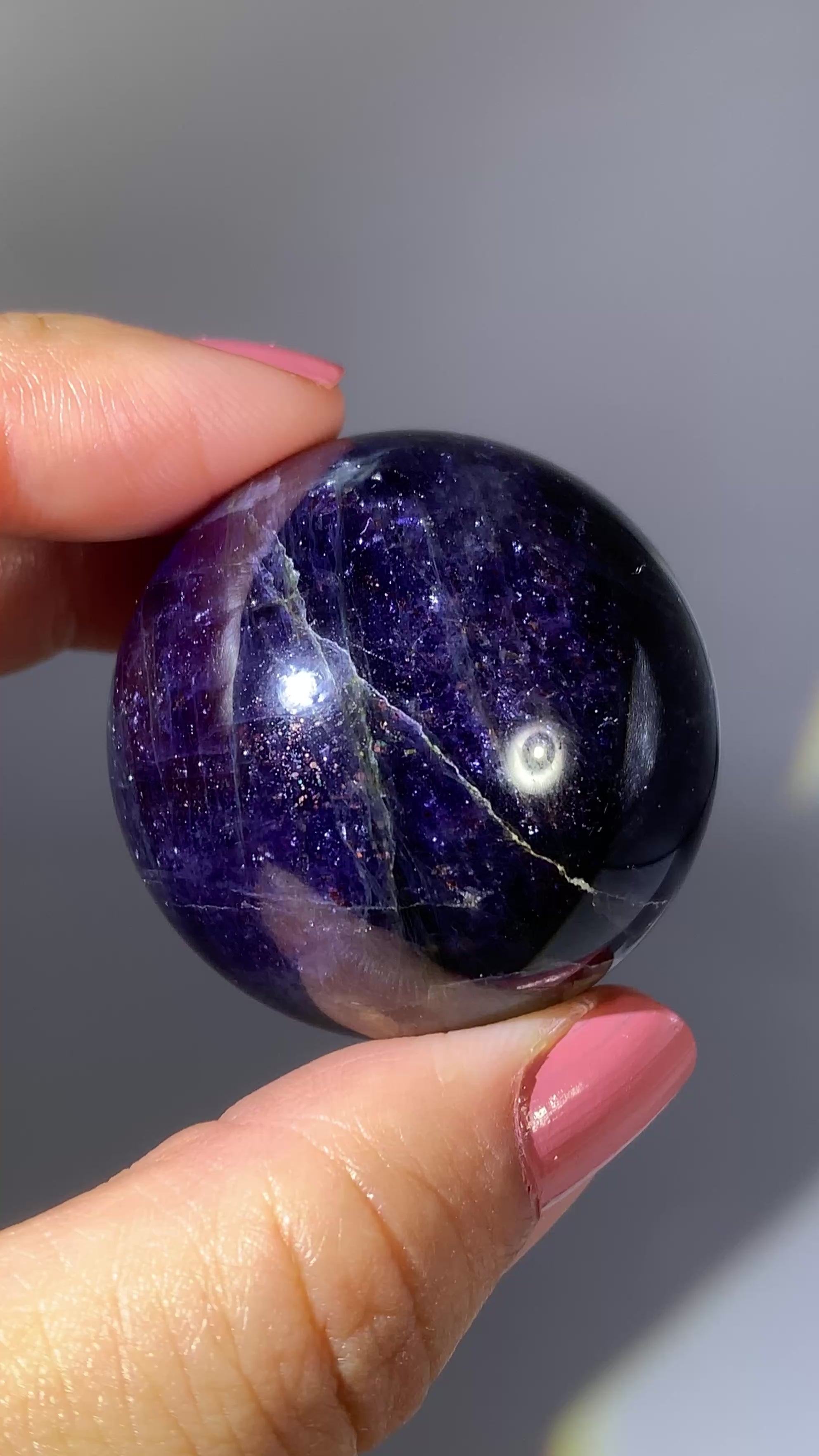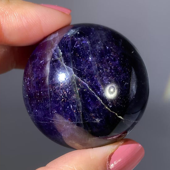 Natural high-grade Galaxy Iolite and Sunstone bloodshot sphere from Tanzania. Rare and collectible, this polished gem crystal sphere showcases stunning color and internal shimmer, perfect for display or serious collectors.