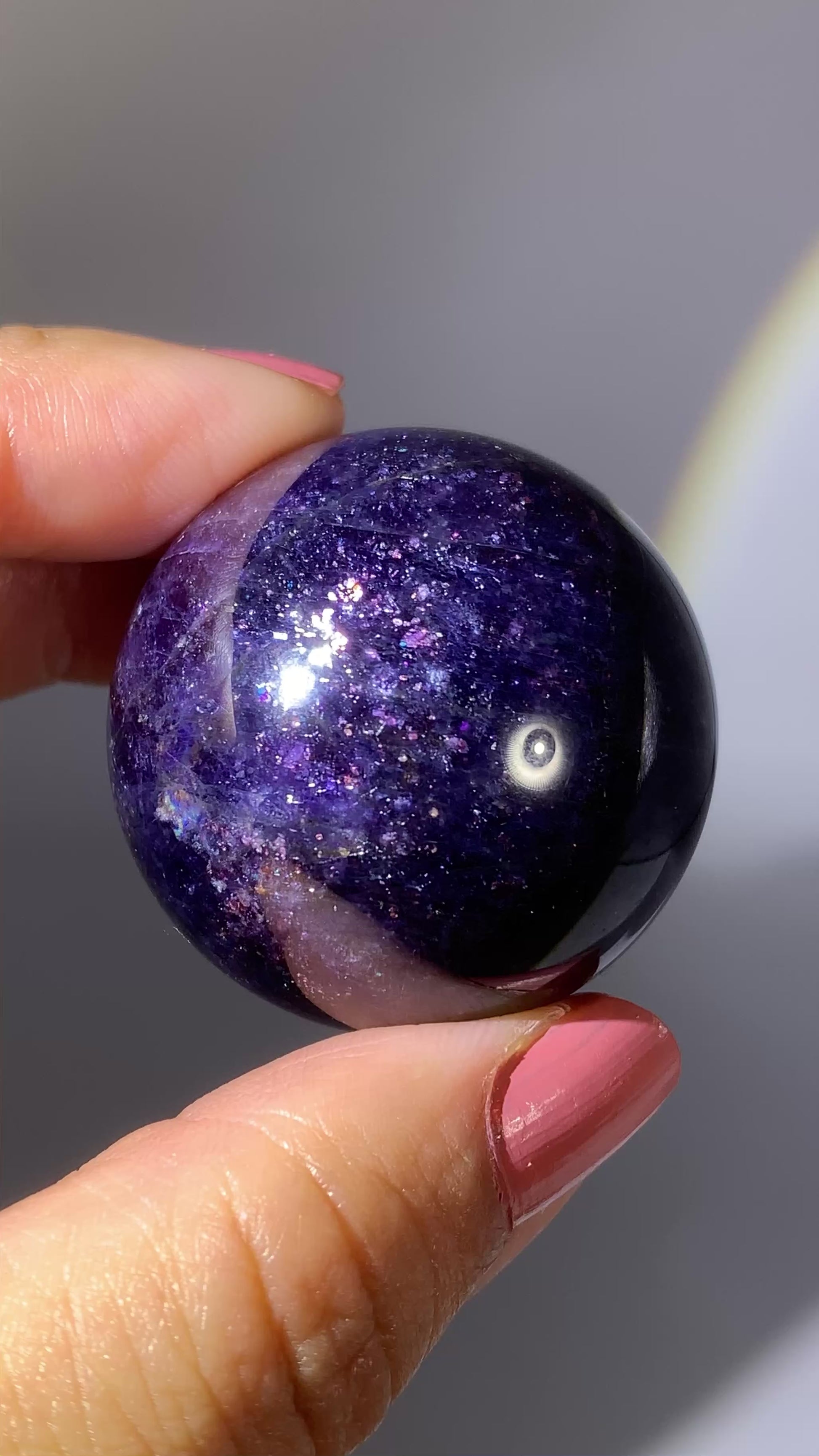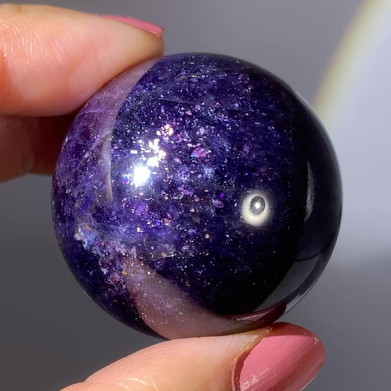 Natural high-grade Galaxy Iolite and Sunstone bloodshot sphere from Tanzania. Rare and collectible, this polished gem crystal sphere showcases stunning color and internal shimmer, perfect for display or serious collectors.