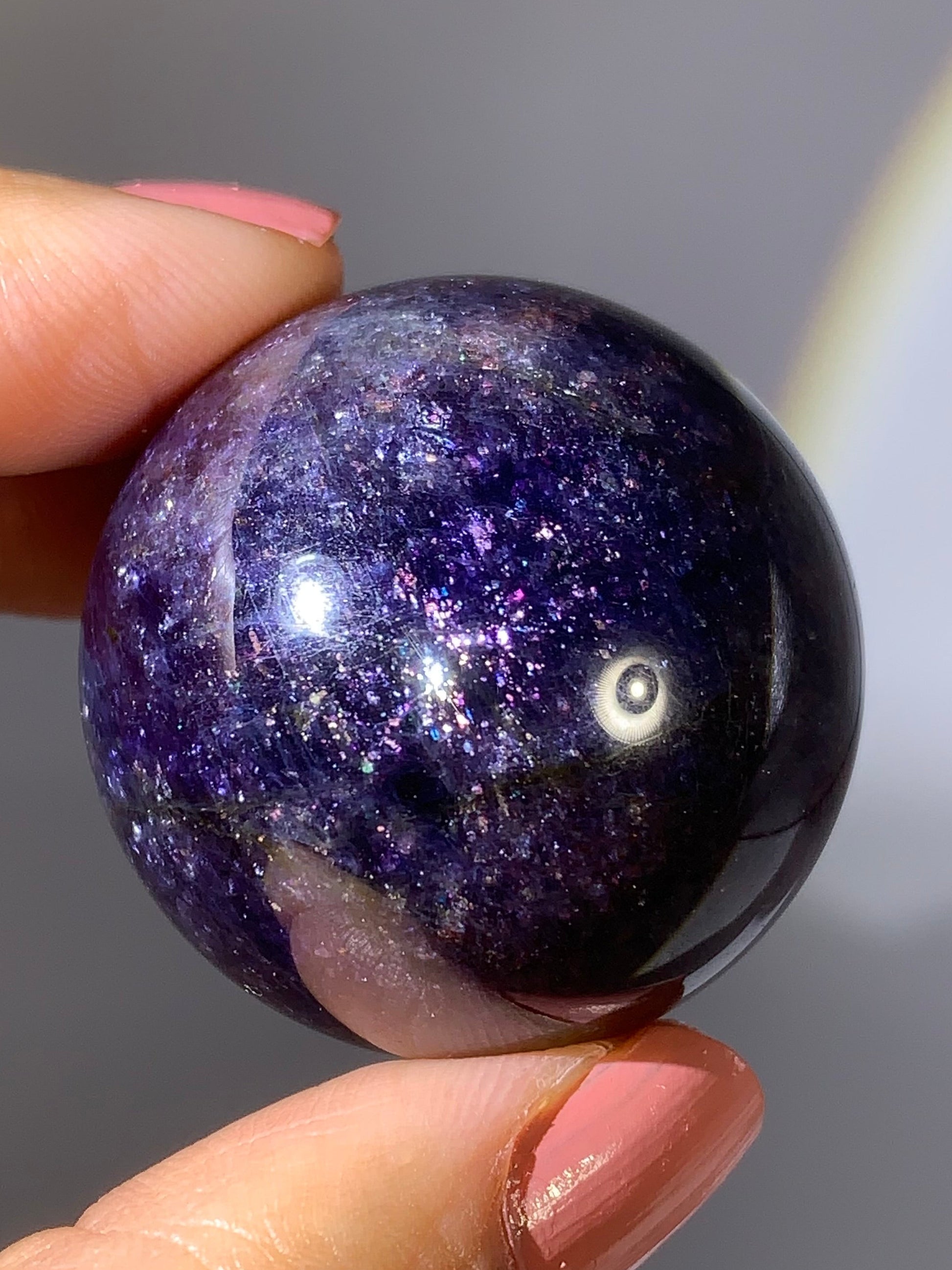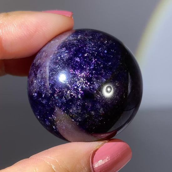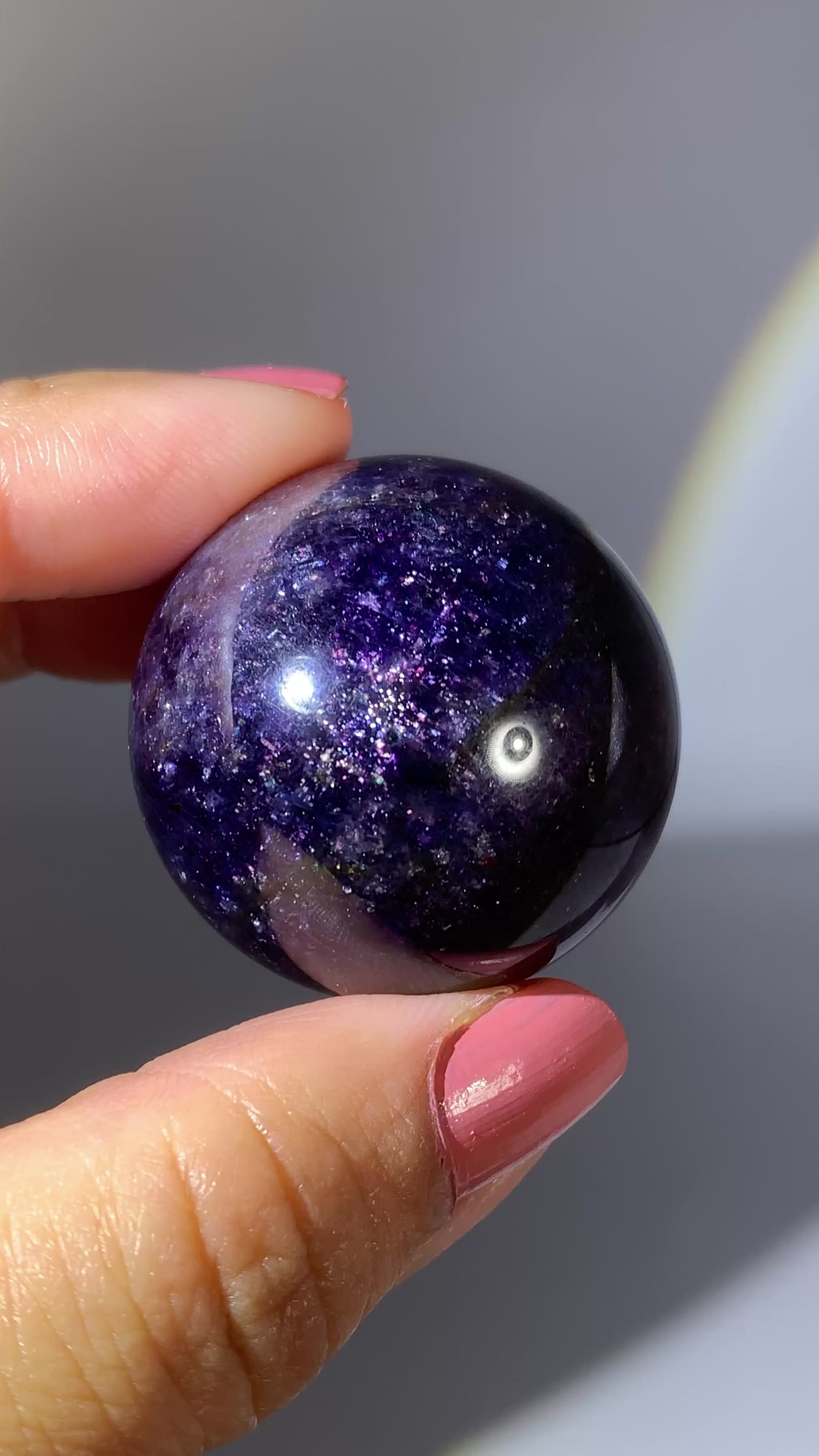 Natural high-grade Galaxy Iolite and Sunstone bloodshot sphere from Tanzania. Rare and collectible, this polished gem crystal sphere showcases stunning color and internal shimmer, perfect for display or serious collectors.