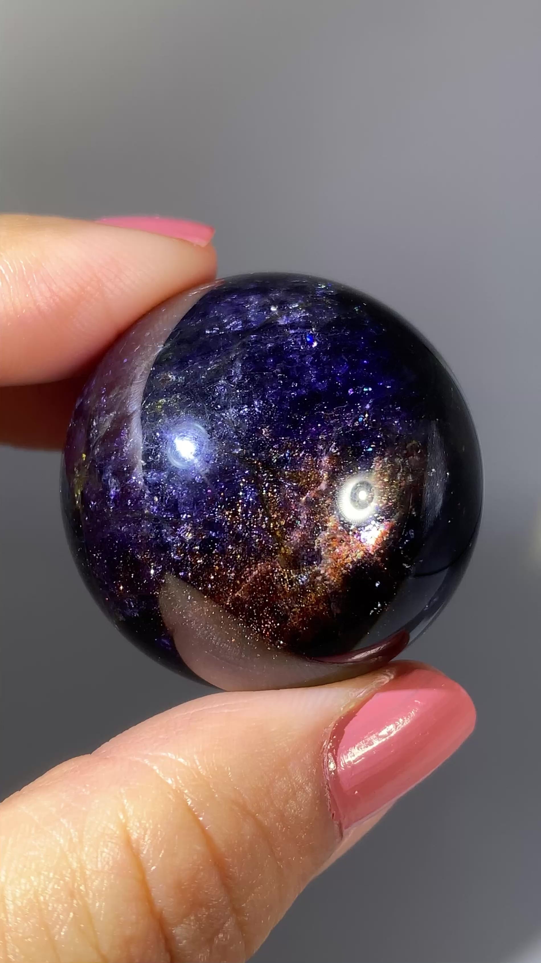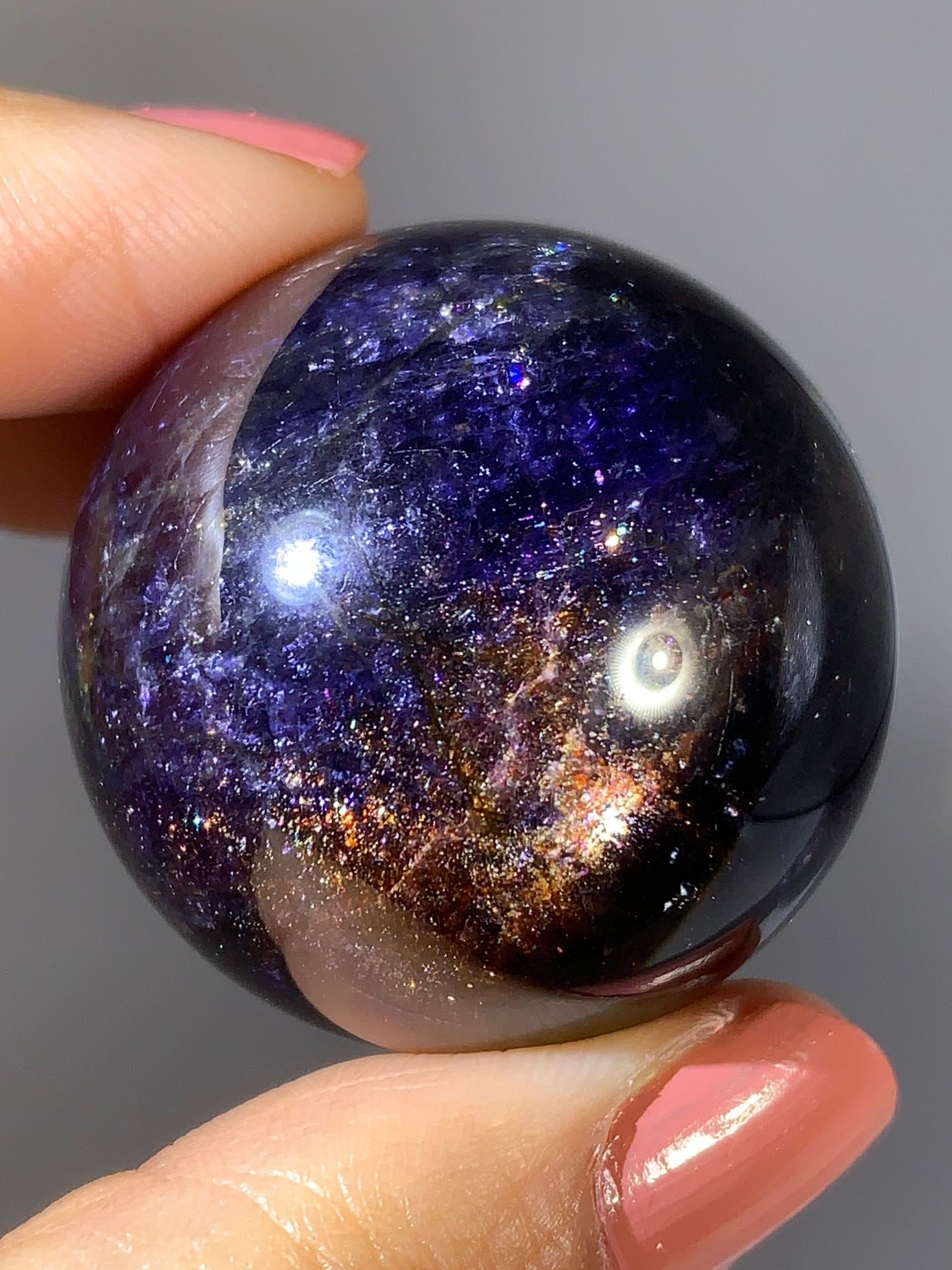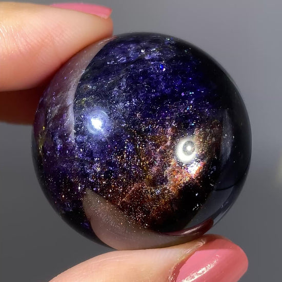 Natural high-grade Galaxy Iolite and Sunstone bloodshot sphere from Tanzania. Rare and collectible, this polished gem crystal sphere showcases stunning color and internal shimmer, perfect for display or serious collectors.