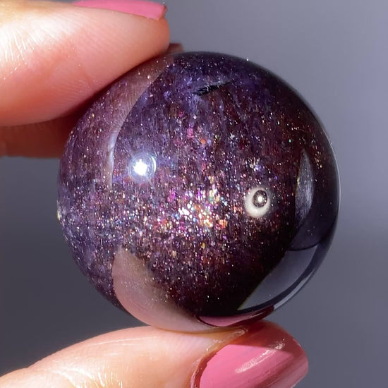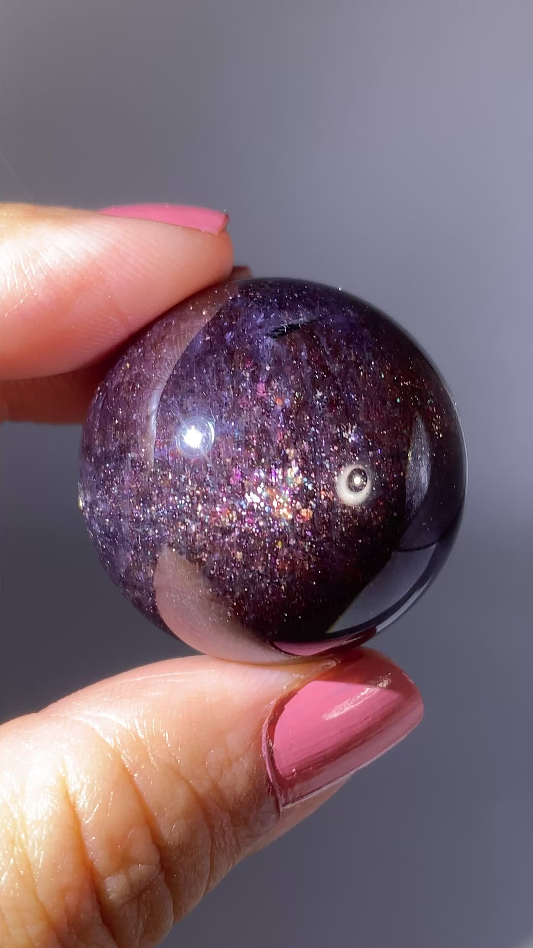Natural high-grade Galaxy Iolite and Sunstone bloodshot sphere from Tanzania. Rare and collectible, this polished gem crystal sphere showcases stunning color and internal shimmer, perfect for display or serious collectors.
