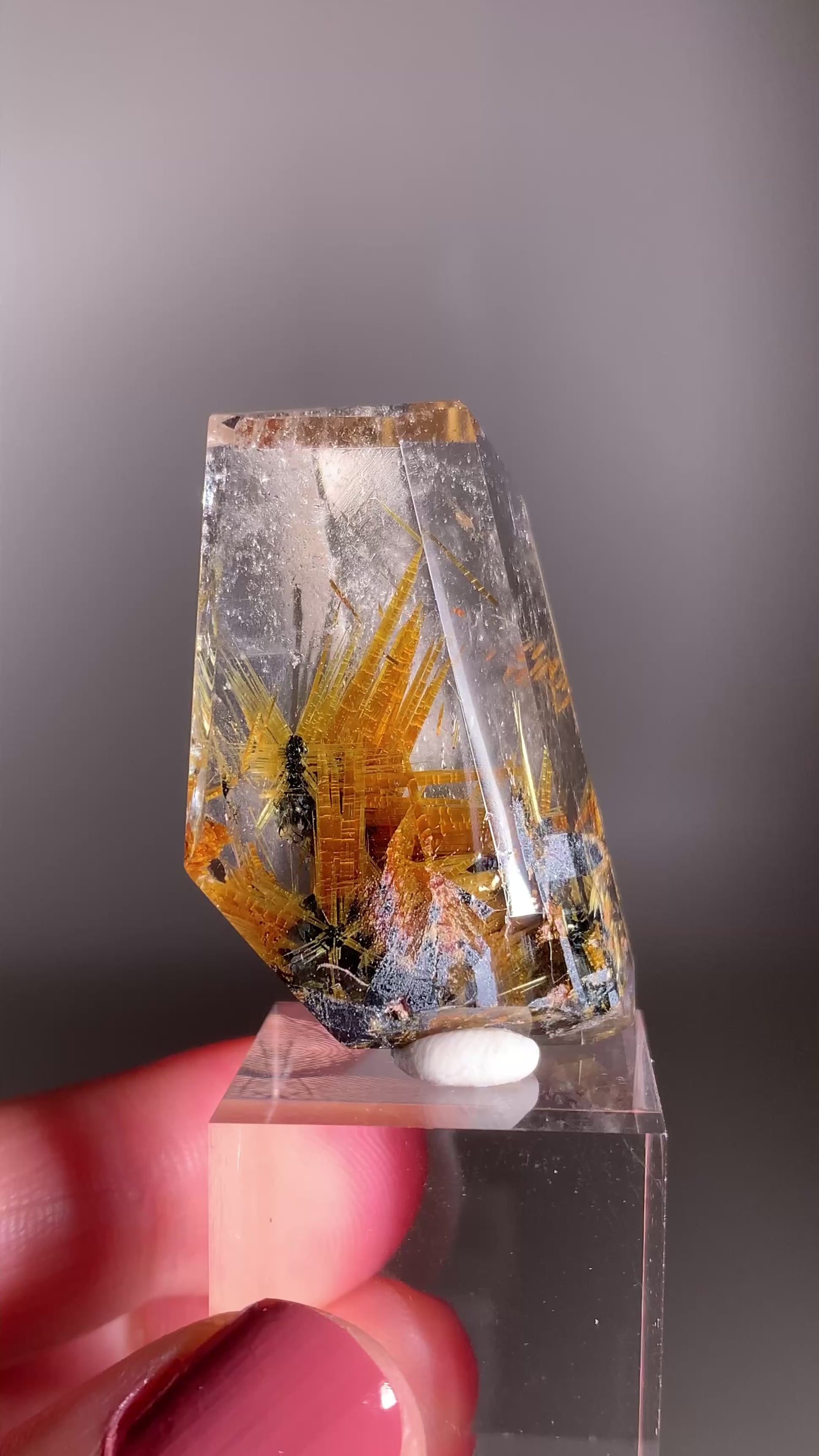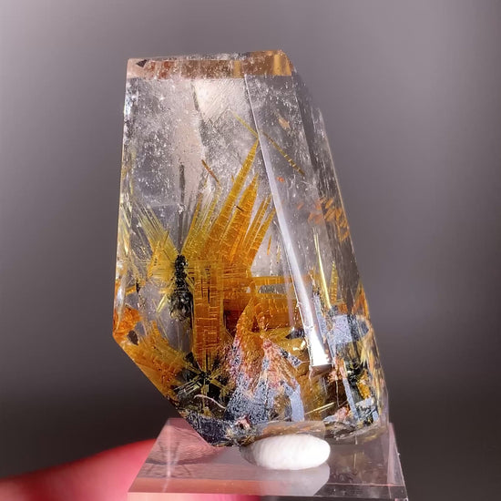 This striking polished freeform showcases golden Novo Horizonte rutile needles elegantly embedded on a dark, metallic hematite base. Hand-polished to highlight its natural patterns and lustrous contrast, this rare crystal was ethically sourced from Brazil.