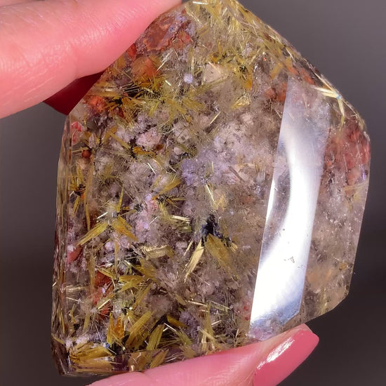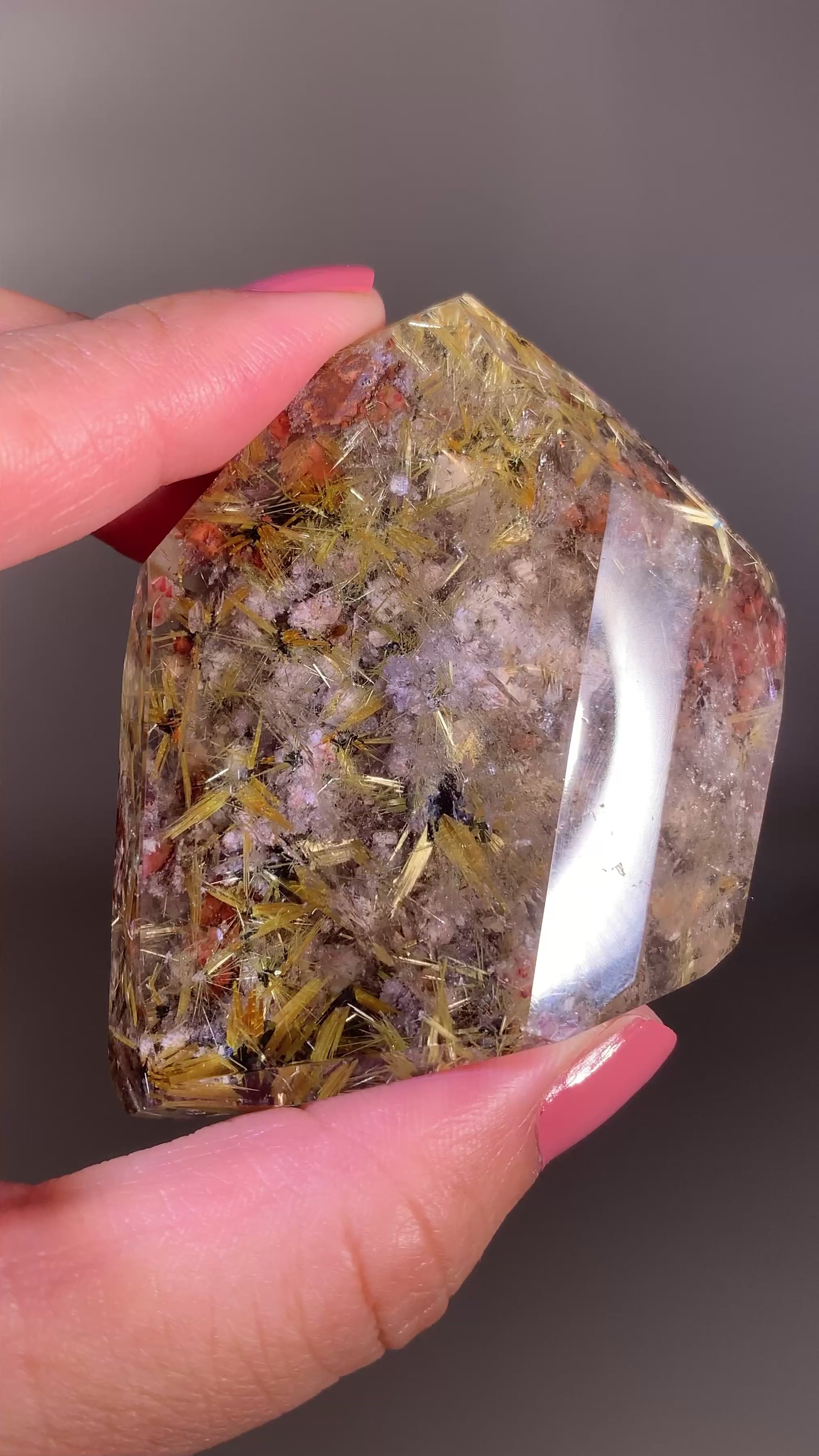 This self-standing polished freeform features Novo Horizonte rutile on hematite from Bahia, Brazil. The dramatic rutile formation contrasts beautifully with the dark, reflective hematite, while its upright, polished shape makes it perfect for display. A unique, eye-catching piece for any collection or space.