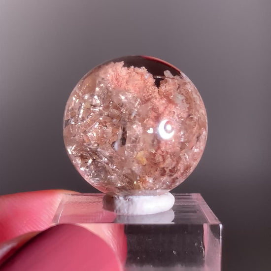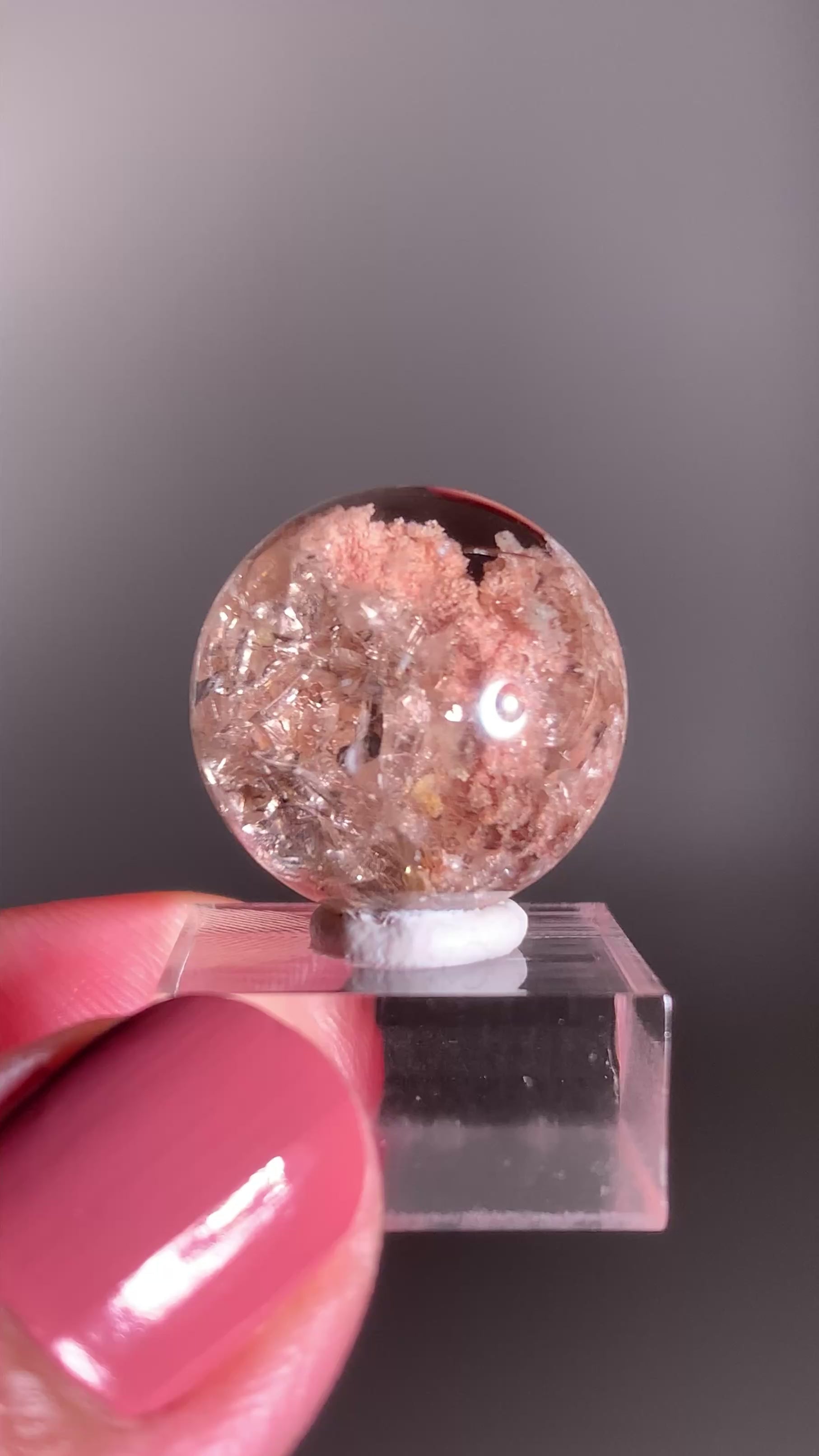 A stunning peach-colored garden quartz sphere from Brazil featuring rare manifestation clusters (crystal within crystal). The intricate internal formations create depth and a one-of-a-kind pattern, making it a captivating collector’s piece full of natural beauty.