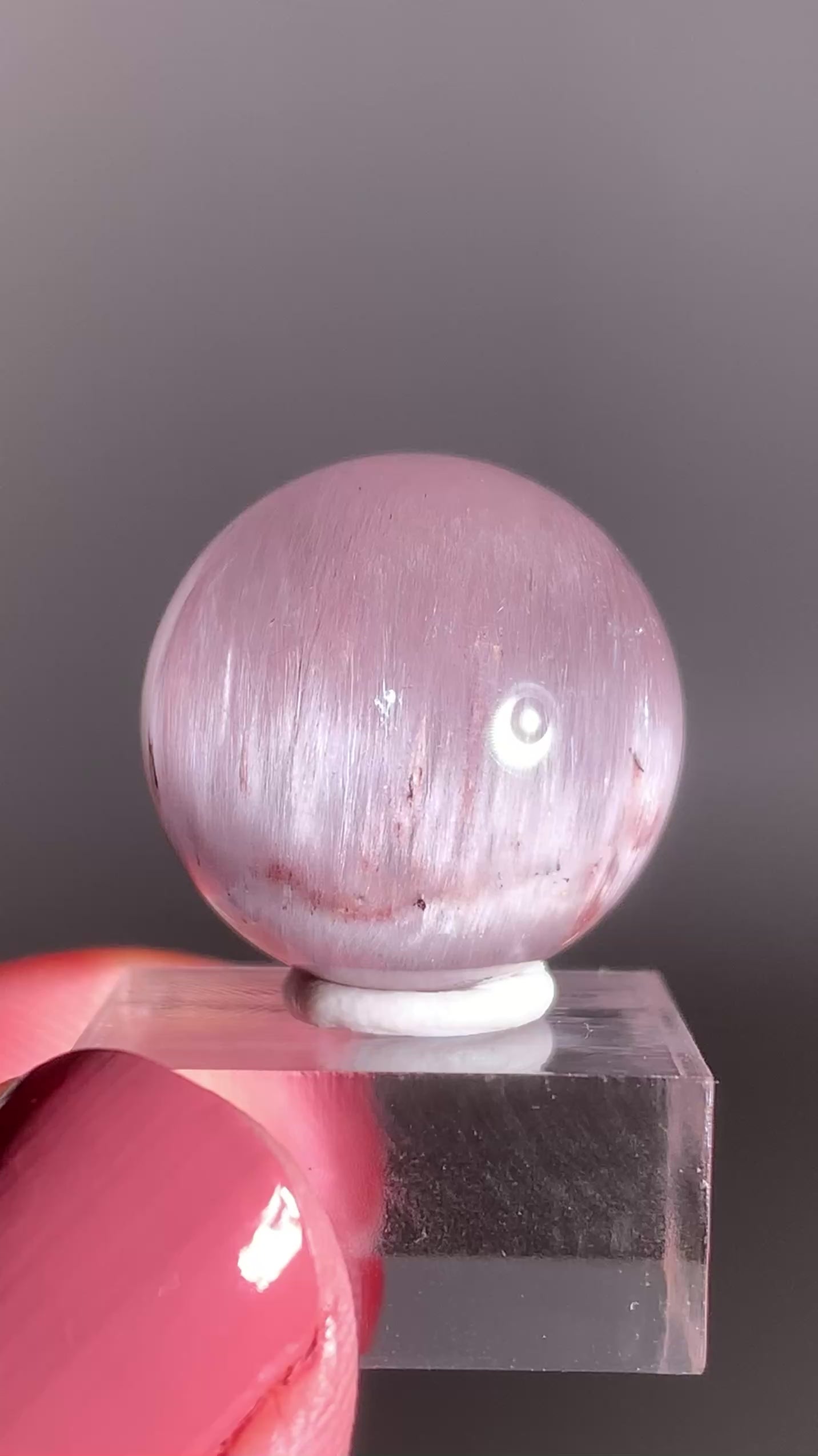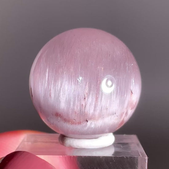 This Pinkish-Purple Amphibole Sphere from Brazil displays dreamy blush tones and soft, cloud-like inclusions that glow under the light. Expertly hand-polished to reveal its silky depth and natural beauty, this rare collector’s crystal radiates gentle, calming energy and pure elegance.