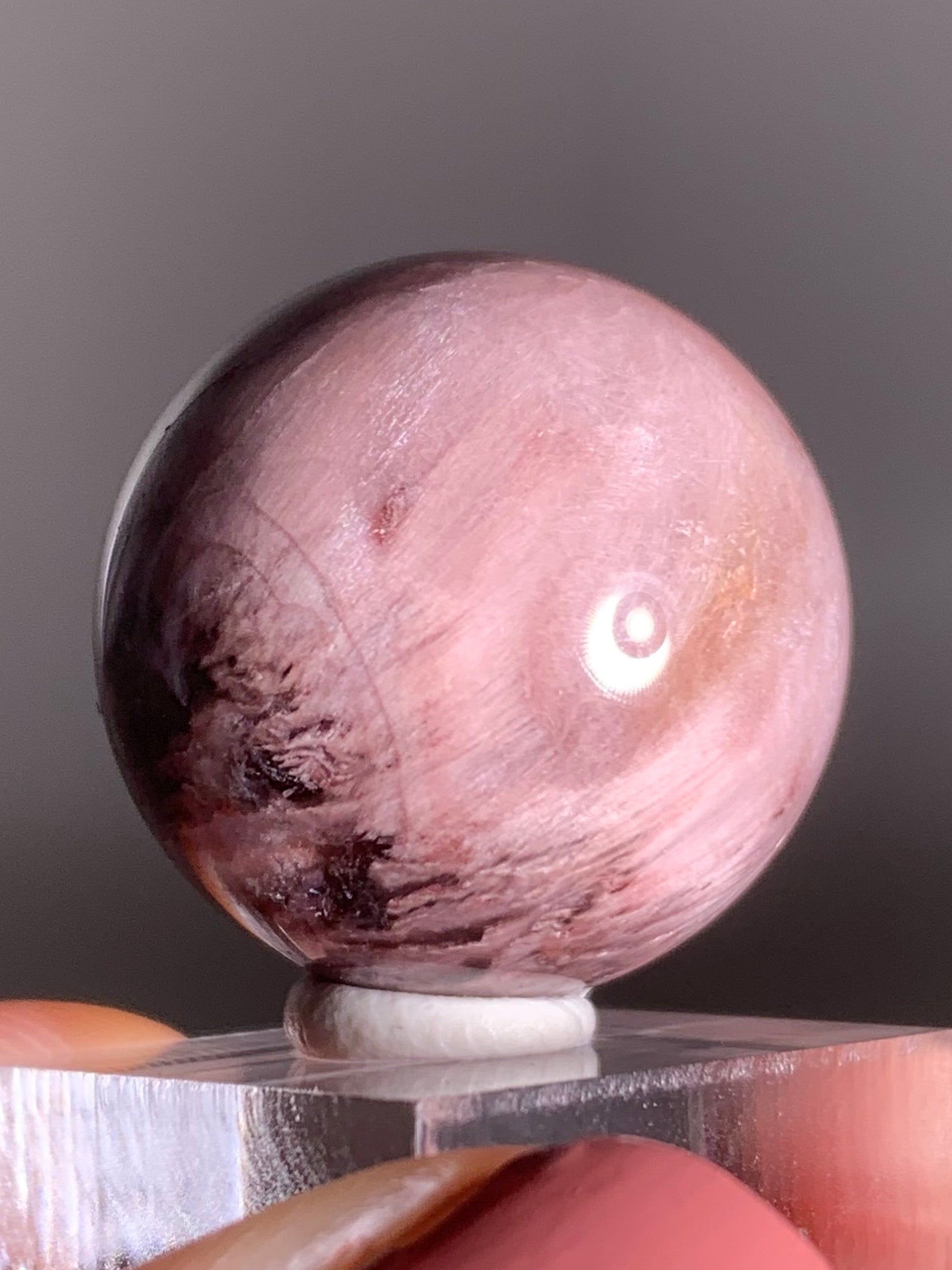 This Pinkish Purple Amphibole Sphere from Brazil displays dreamy blush tones and soft, cloud-like inclusions that glow under the light. Expertly hand-polished to reveal its silky depth and natural beauty, this rare collector’s crystal radiates gentle, calming energy and pure elegance.