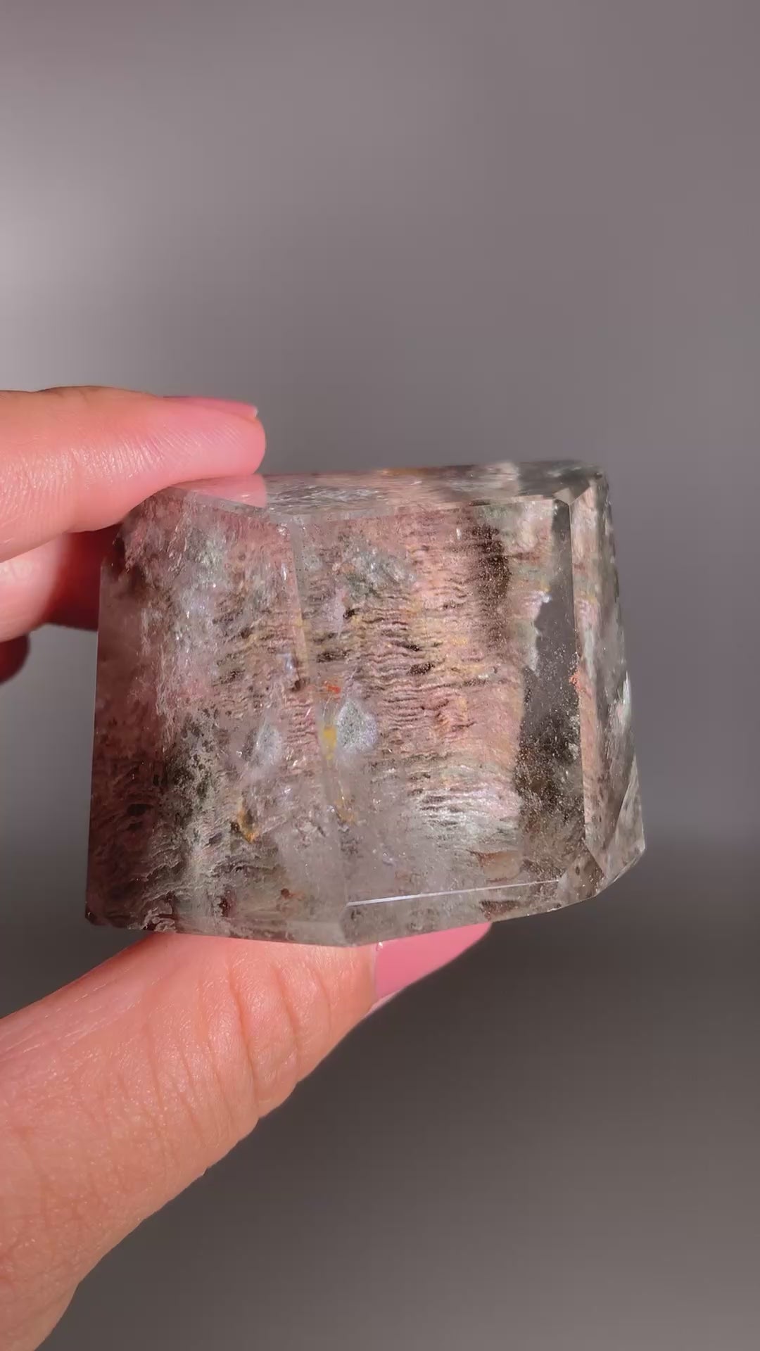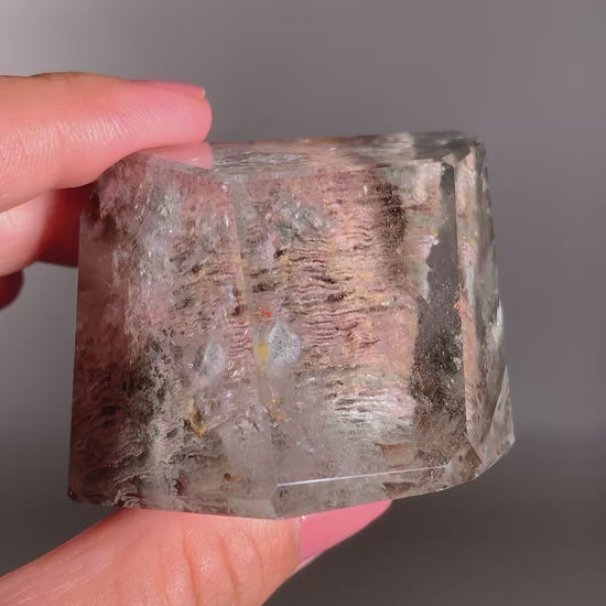 This polished Garden Quartz freeform from Zambia features delicate pink, sage-green and red layers, creating a soft, dreamy landscape within the crystal. A unique and calming piece perfect for display or meditation.