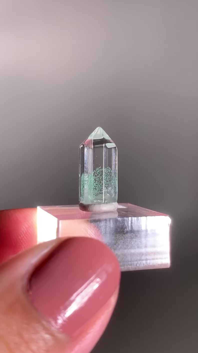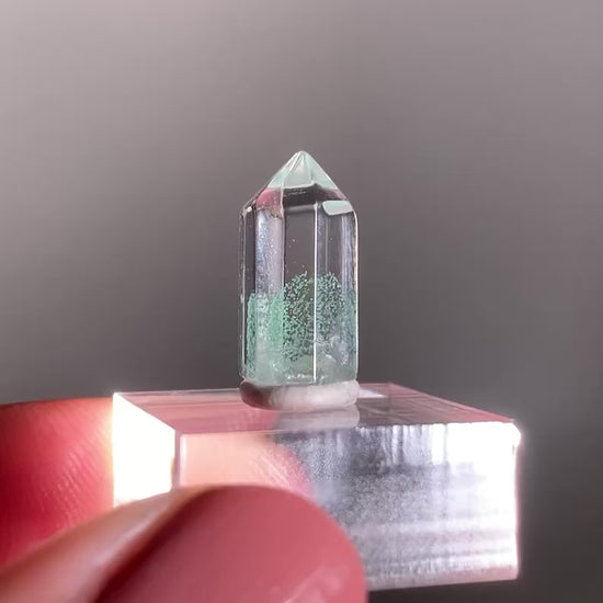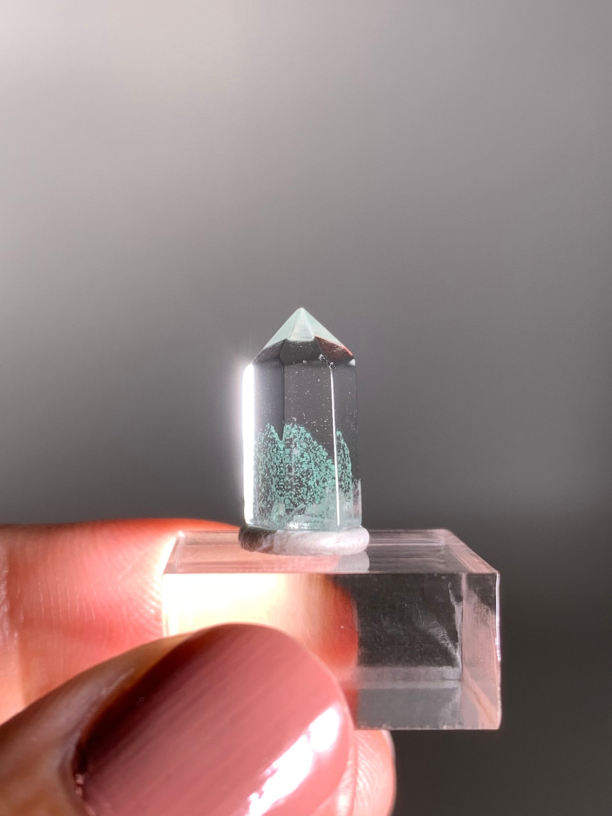 A rare and exquisite crystal, this polished phantom quartz tower from Madagascar features a unique Tiffany Blue hue—a soft, pastel aqua rarely seen in quartz. This exceptionally rare coloration is found only in select deposits from Madagascar. Natural phantom formations within the stone reveal ghost-like layers of earlier crystal growth, creating stunning visual depth. Highly sought after for both its beauty and rarity, this piece is ideal for collectors and crystal enthusiasts alike.