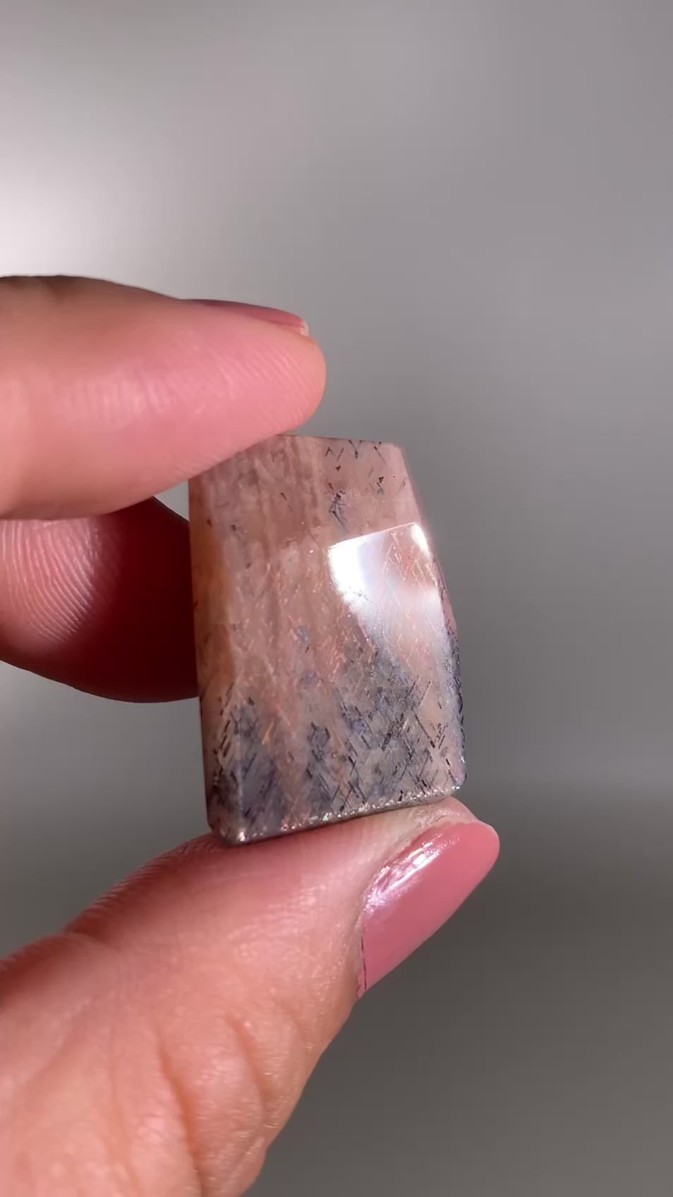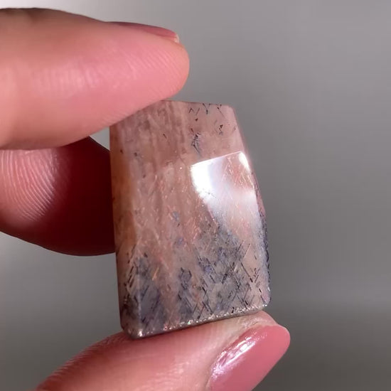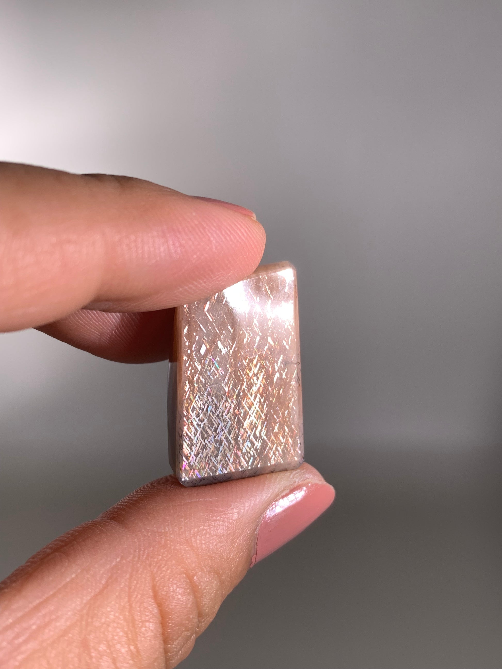 A rare and captivating polished freeform of Rainbow Lattice Sunstone from Tanzania, featuring shimmering lattice-like inclusions of hematite and magnetite that reflect flashes of rainbow iridescence. Set in a warm feldspar matrix, this exceptional gemstone displays a natural optical phenomenon — a dazzling fusion of light, structure, and mineral beauty.