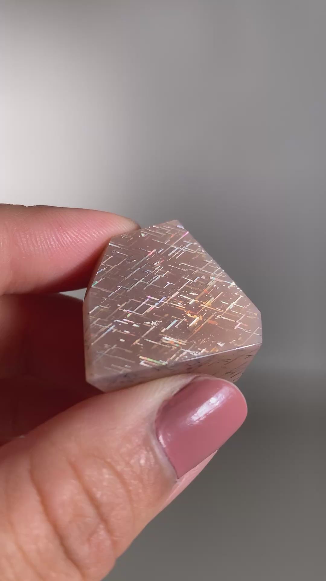 A rare and dazzling feldspar featuring shimmering lattice-like inclusions and vibrant rainbow flashes — a true collector’s gemstone with cosmic beauty.