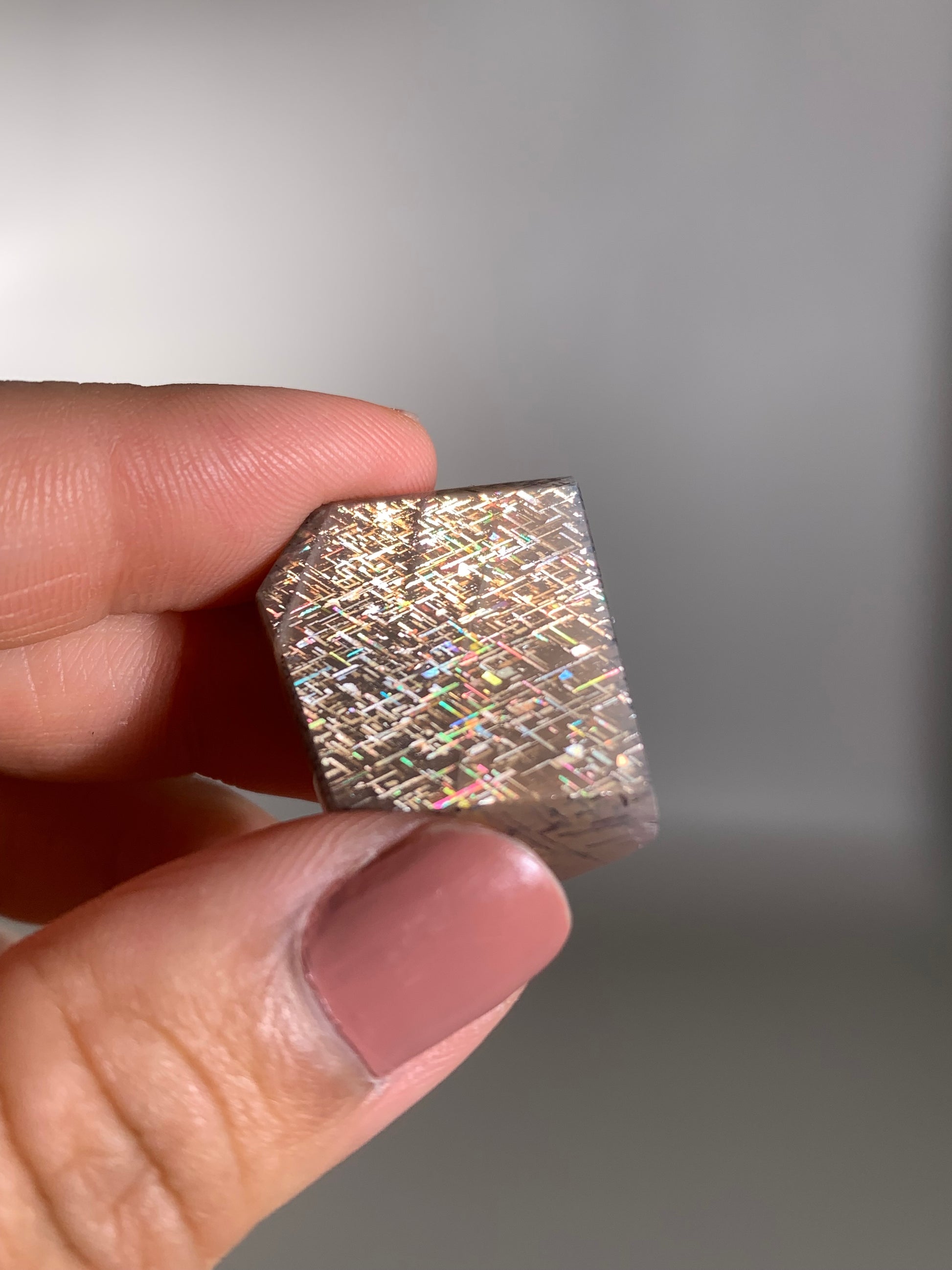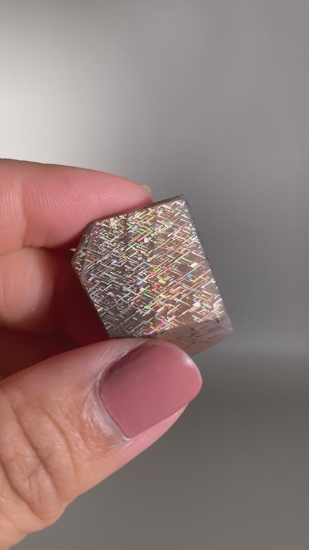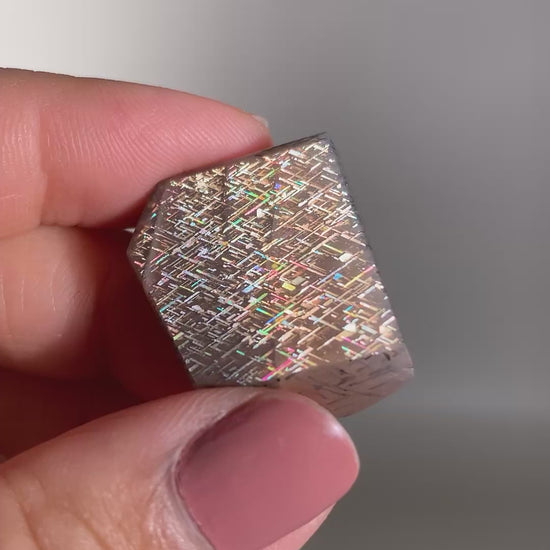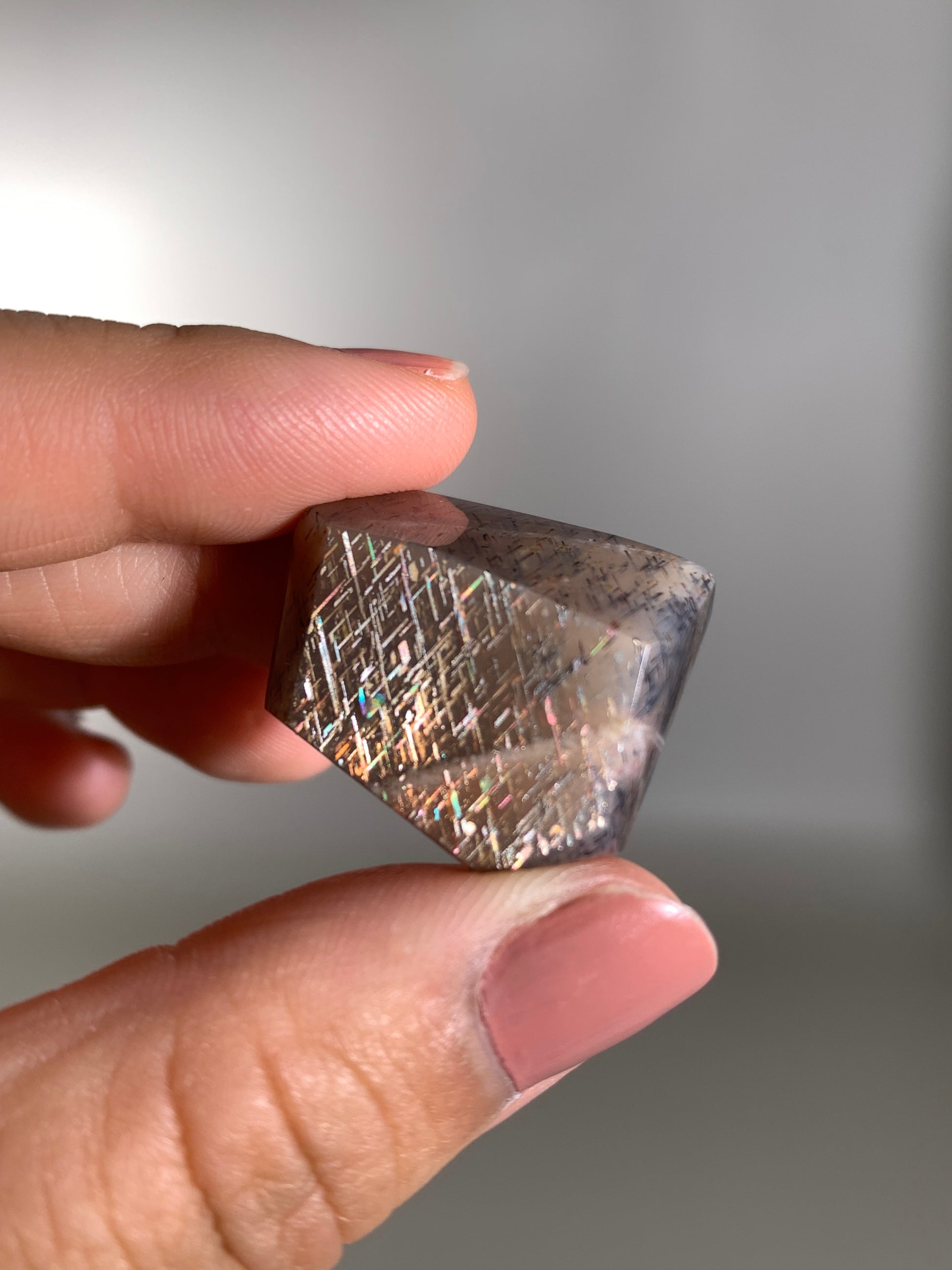 A rare and captivating polished freeform of Rainbow Lattice Sunstone from Tanzania, featuring shimmering lattice-like inclusions of hematite and magnetite that reflect flashes of rainbow iridescence. Set in a warm feldspar matrix, this exceptional gemstone displays a natural optical phenomenon — a dazzling fusion of light, structure, and mineral beauty.