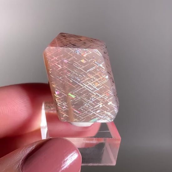 A rare and captivating polished freeform of Rainbow Lattice Sunstone from Tanzania, featuring shimmering lattice-like inclusions of hematite and magnetite that reflect flashes of rainbow iridescence. Set in a warm feldspar matrix, this exceptional gemstone displays a natural optical phenomenon — a dazzling fusion of light, structure, and mineral beauty.