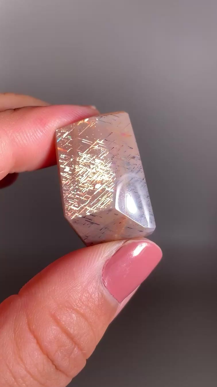 A rare and captivating polished freeform of Rainbow Lattice Sunstone from Tanzania, featuring shimmering lattice-like inclusions of hematite and magnetite that reflect flashes of rainbow iridescence. Set in a warm feldspar matrix, this exceptional gemstone displays a natural optical phenomenon — a dazzling fusion of light, structure, and mineral beauty.
