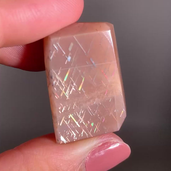 A rare and dazzling feldspar featuring shimmering lattice-like inclusions and vibrant rainbow flashes — a true collector’s gemstone with cosmic beauty.