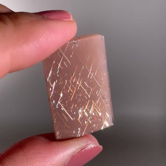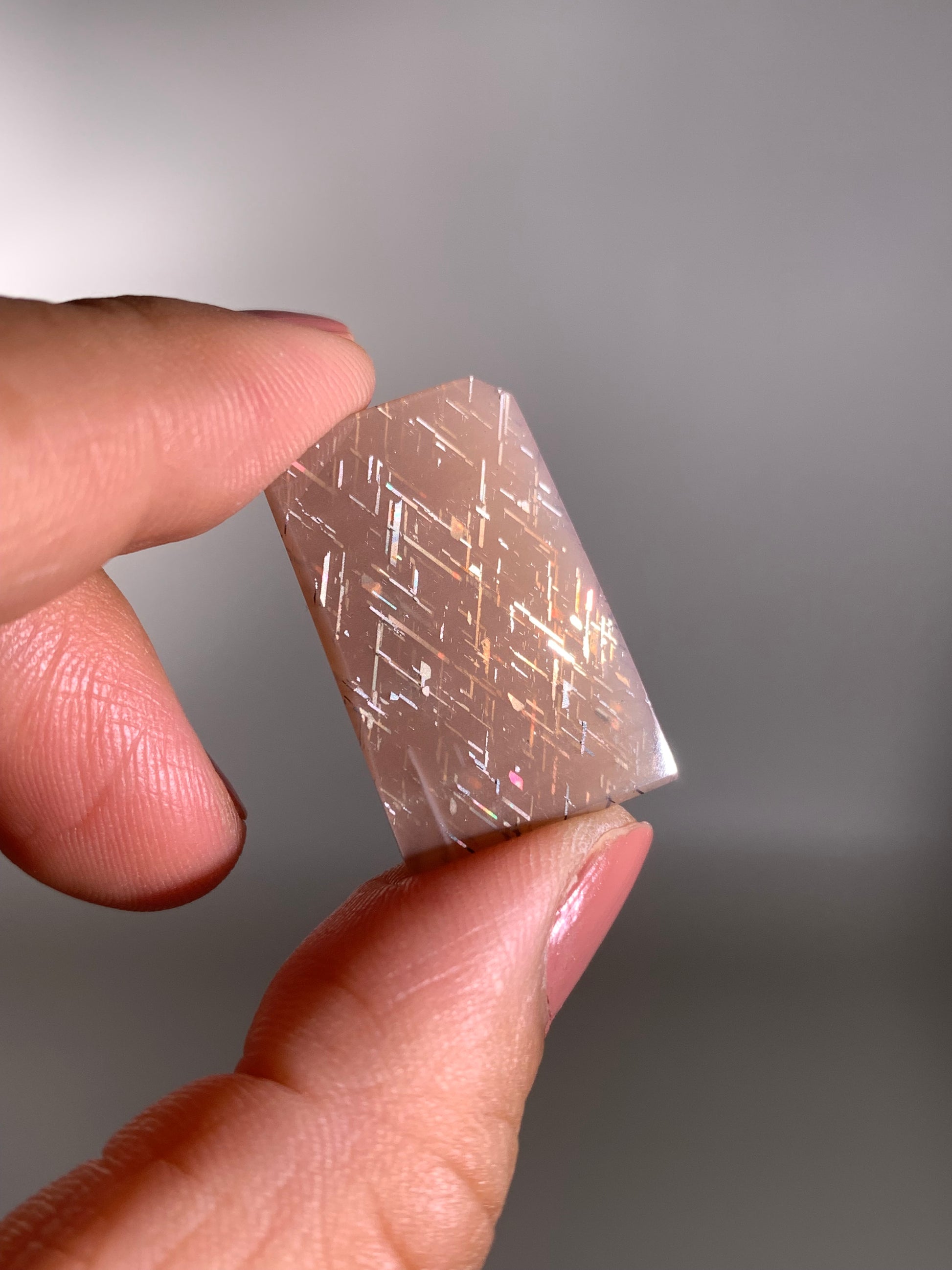 A rare and captivating polished freeform of Rainbow Lattice Sunstone from Tanzania, featuring shimmering lattice-like inclusions of hematite and magnetite that reflect flashes of rainbow iridescence. Set in a warm feldspar matrix, this exceptional gemstone displays a natural optical phenomenon — a dazzling fusion of light, structure, and mineral beauty.