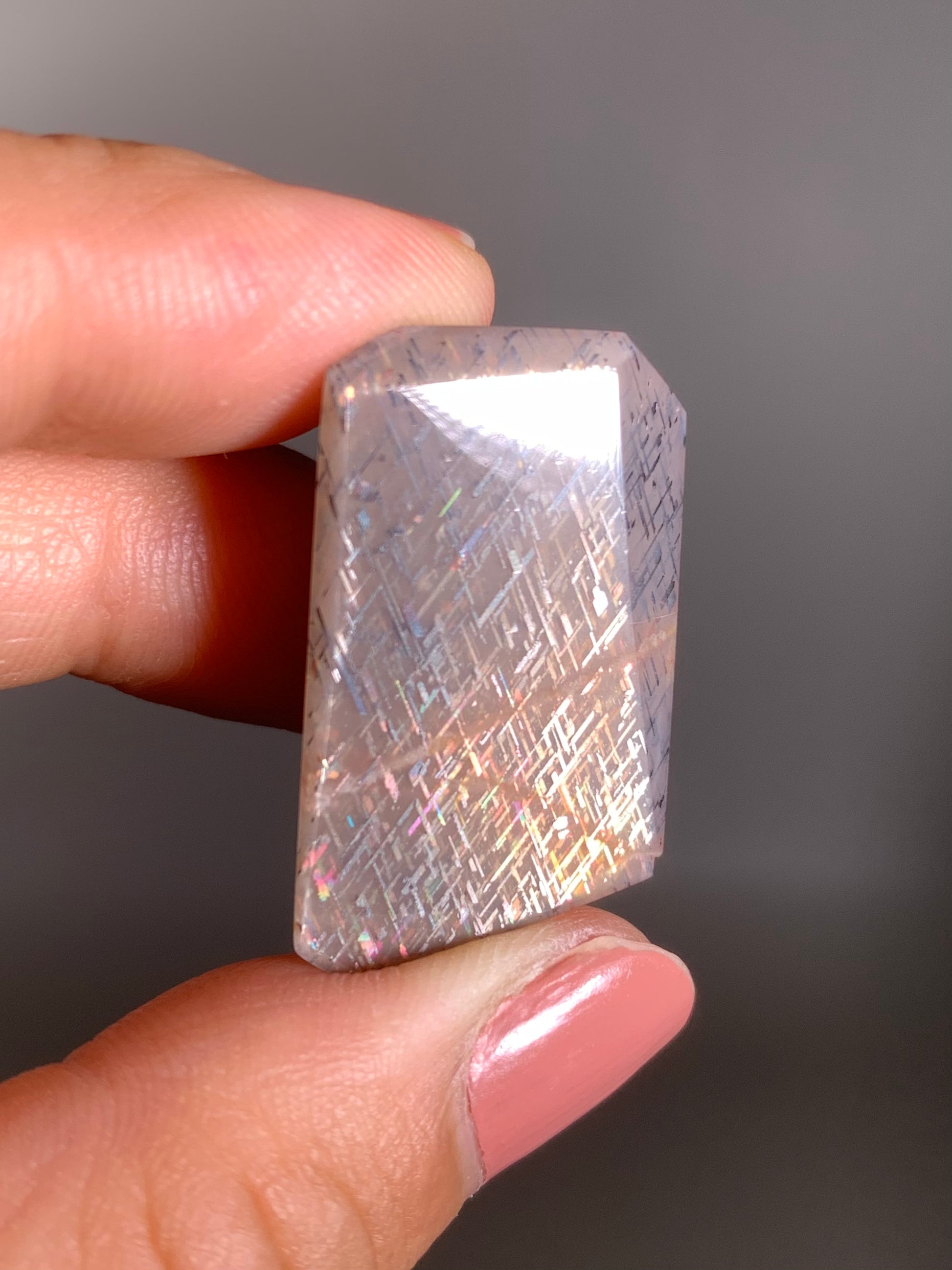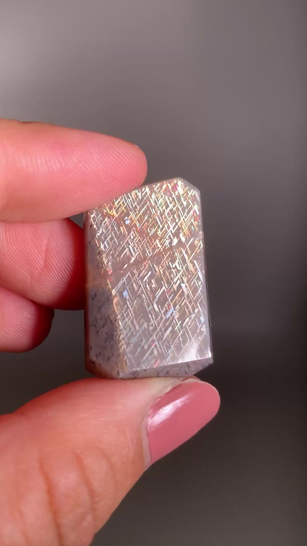 A rare and dazzling feldspar featuring shimmering lattice-like inclusions and vibrant rainbow flashes — a true collector’s gemstone with cosmic beauty.