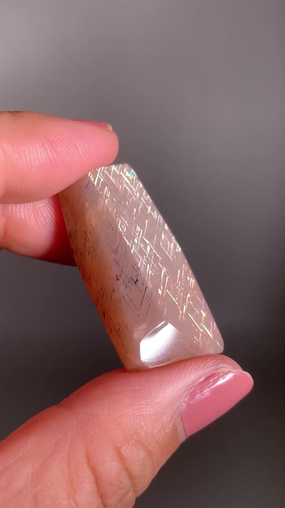 A rare and dazzling feldspar featuring shimmering lattice-like inclusions and vibrant rainbow flashes — a true collector’s gemstone with cosmic beauty.