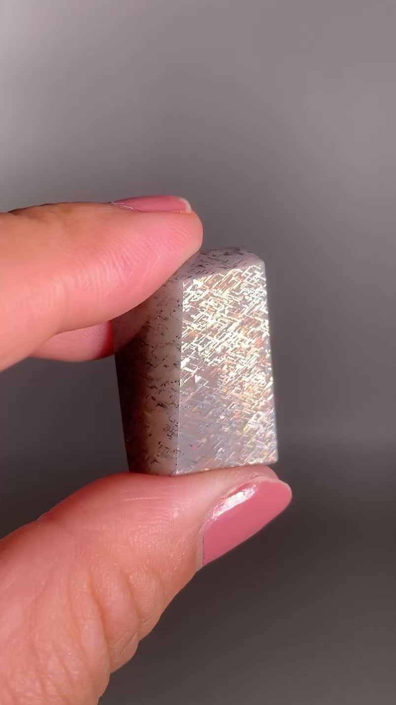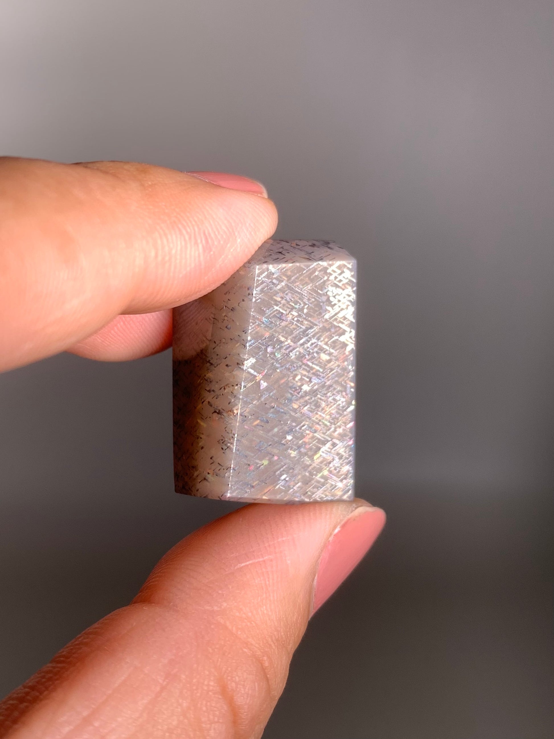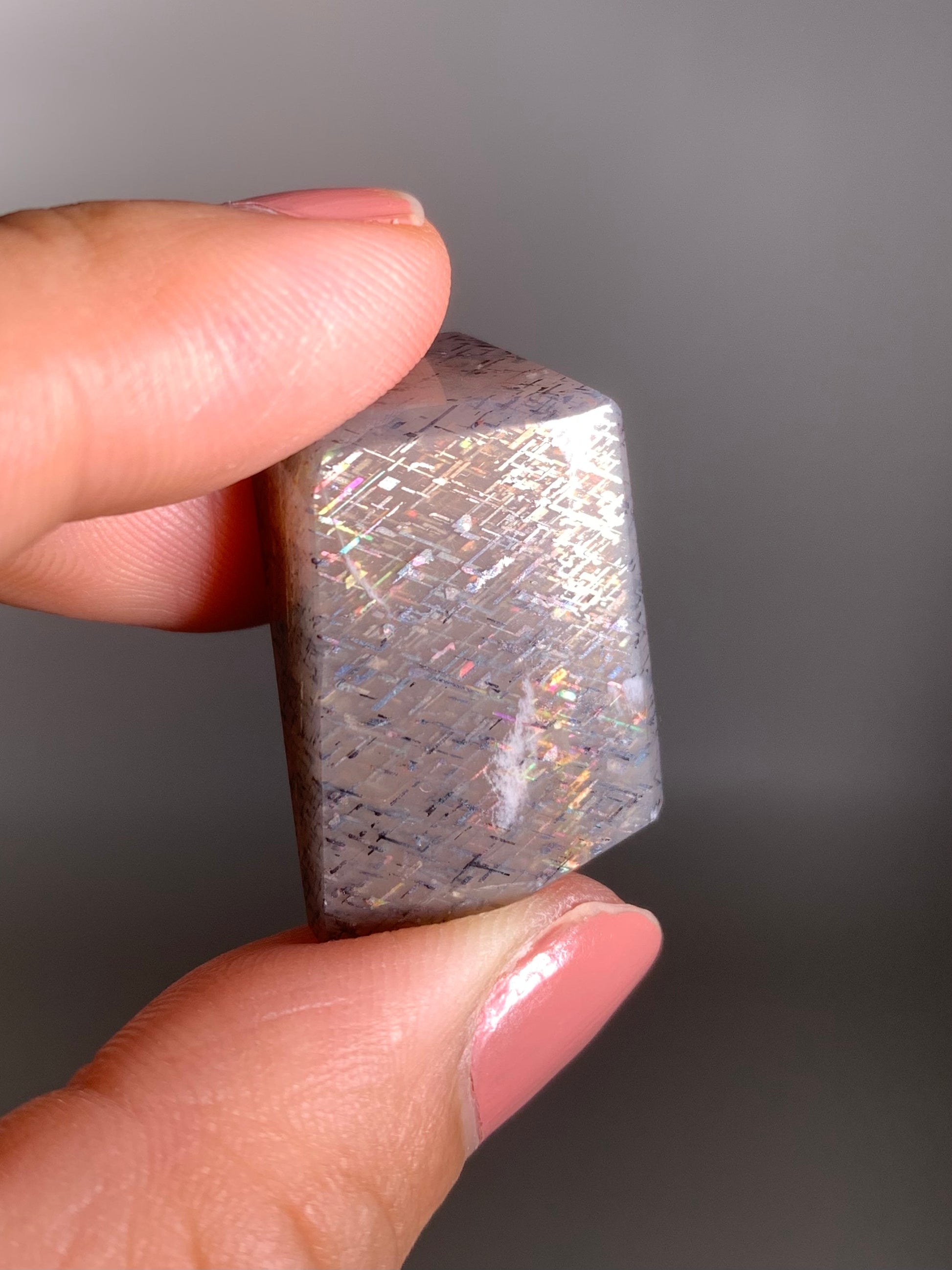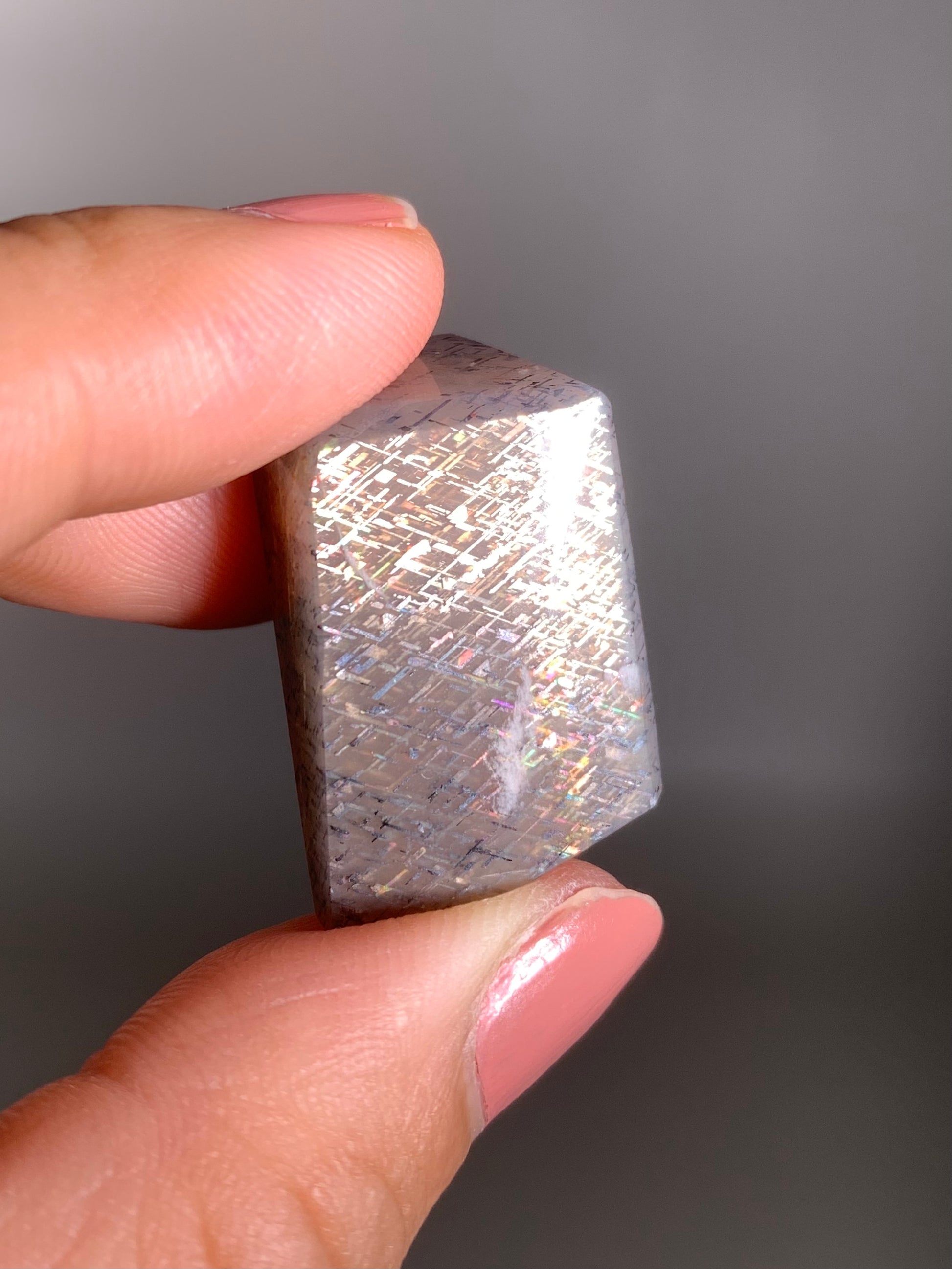 A rare and dazzling feldspar featuring shimmering lattice-like inclusions and vibrant rainbow flashes — a true collector’s gemstone with cosmic beauty.