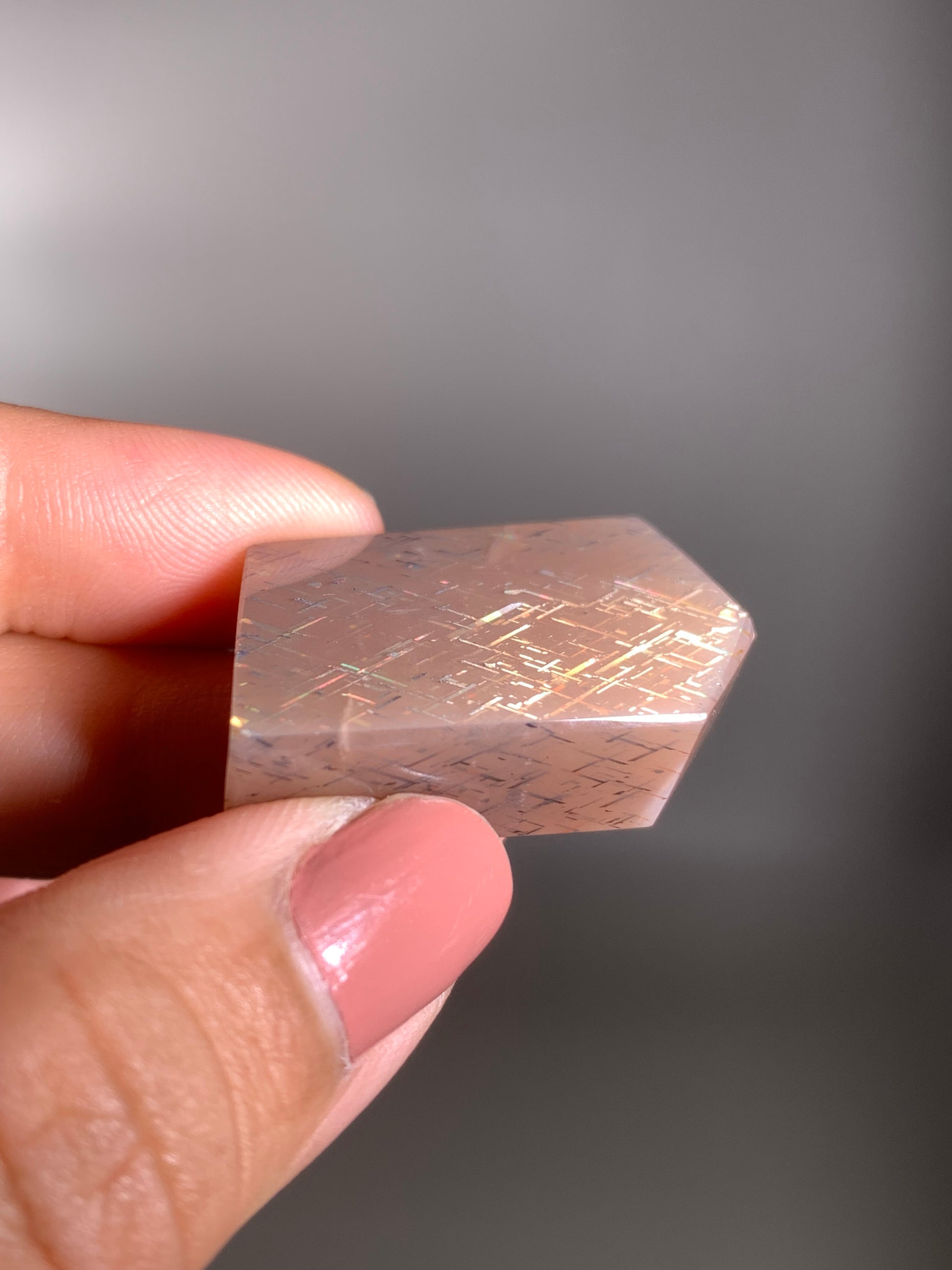 A rare and dazzling feldspar featuring shimmering lattice-like inclusions and vibrant rainbow flashes — a true collector’s gemstone with cosmic beauty.