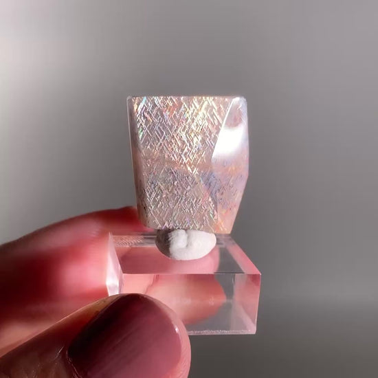 A rare and captivating polished freeform of Rainbow Lattice Sunstone from Tanzania, featuring shimmering lattice-like inclusions of hematite and magnetite that reflect flashes of rainbow iridescence. Set in a warm feldspar matrix, this exceptional gemstone displays a natural optical phenomenon — a dazzling fusion of light, structure, and mineral beauty.