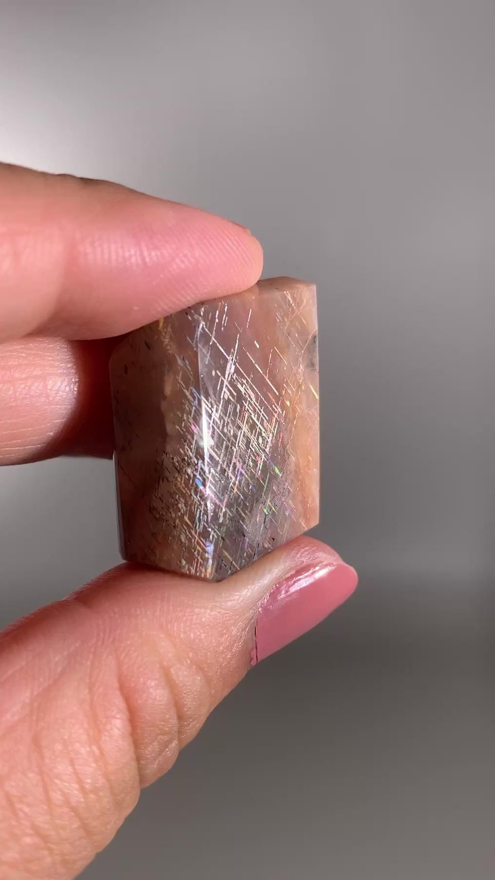 A rare and captivating polished freeform of Rainbow Lattice Sunstone from Tanzania, featuring shimmering lattice-like inclusions of hematite and magnetite that reflect flashes of rainbow iridescence. Set in a warm feldspar matrix, this exceptional gemstone displays a natural optical phenomenon — a dazzling fusion of light, structure, and mineral beauty.