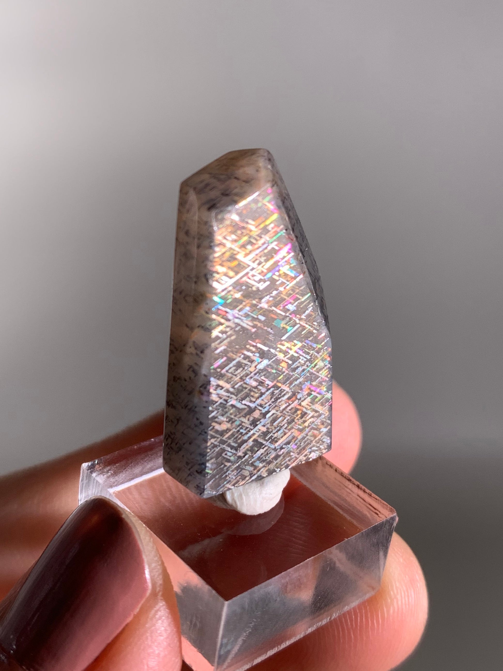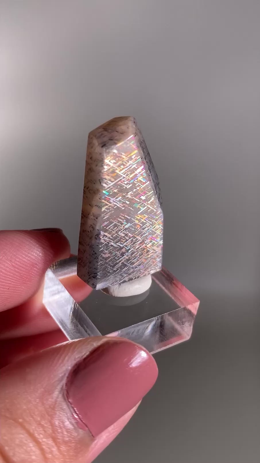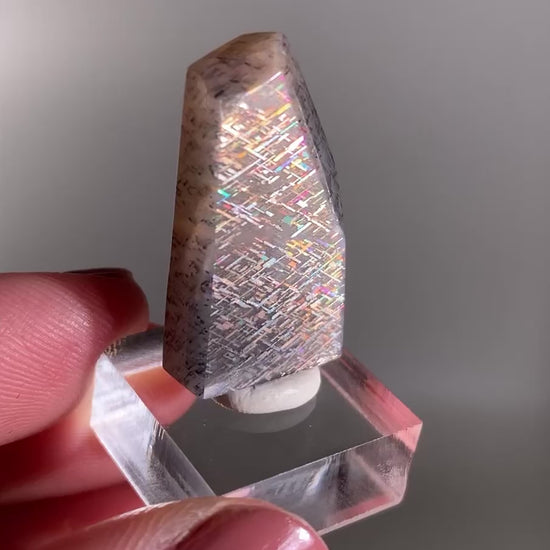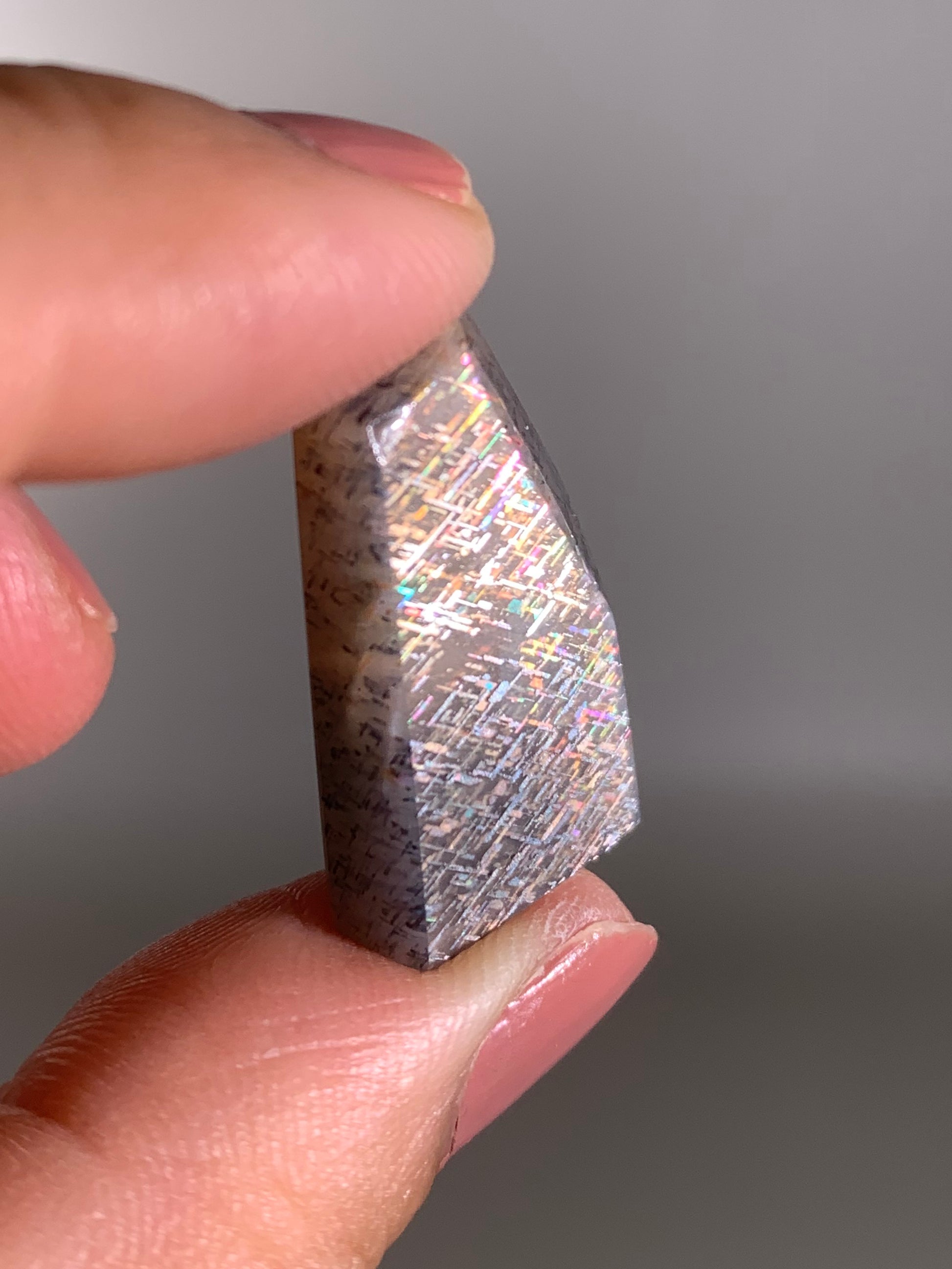 A rare and captivating polished freeform of Rainbow Lattice Sunstone from Tanzania, featuring shimmering lattice-like inclusions of hematite and magnetite that reflect flashes of rainbow iridescence. Set in a warm feldspar matrix, this exceptional gemstone displays a natural optical phenomenon — a dazzling fusion of light, structure, and mineral beauty.