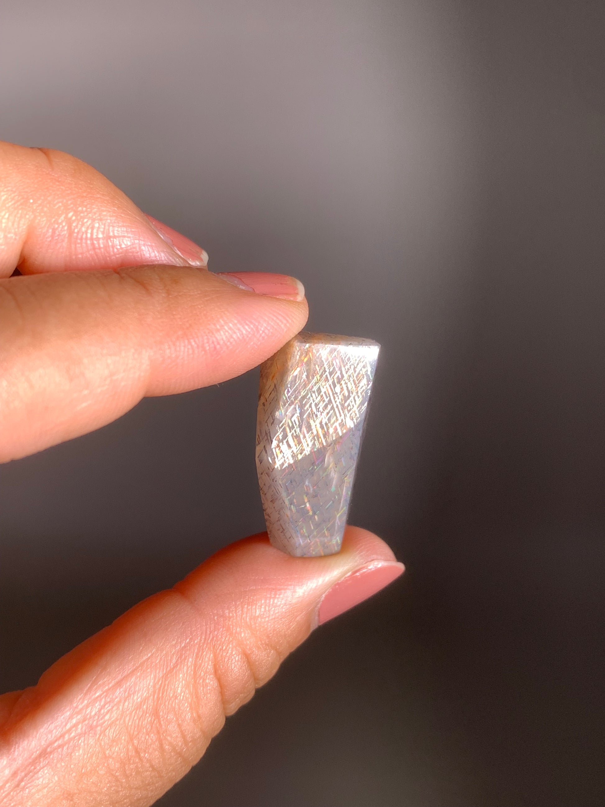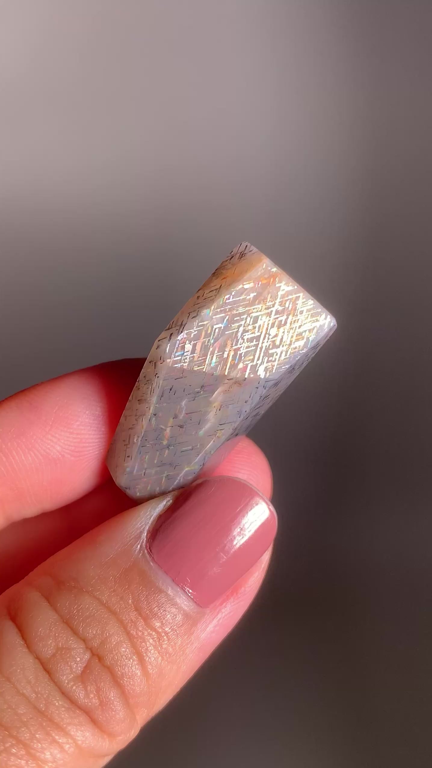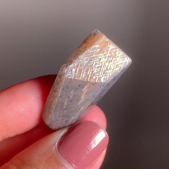Rainbow Lattice Sunstone from Tanzania is a rare gem with sparkling lattice patterns and flashes of rainbow color — a natural stunner that’s totally unique.