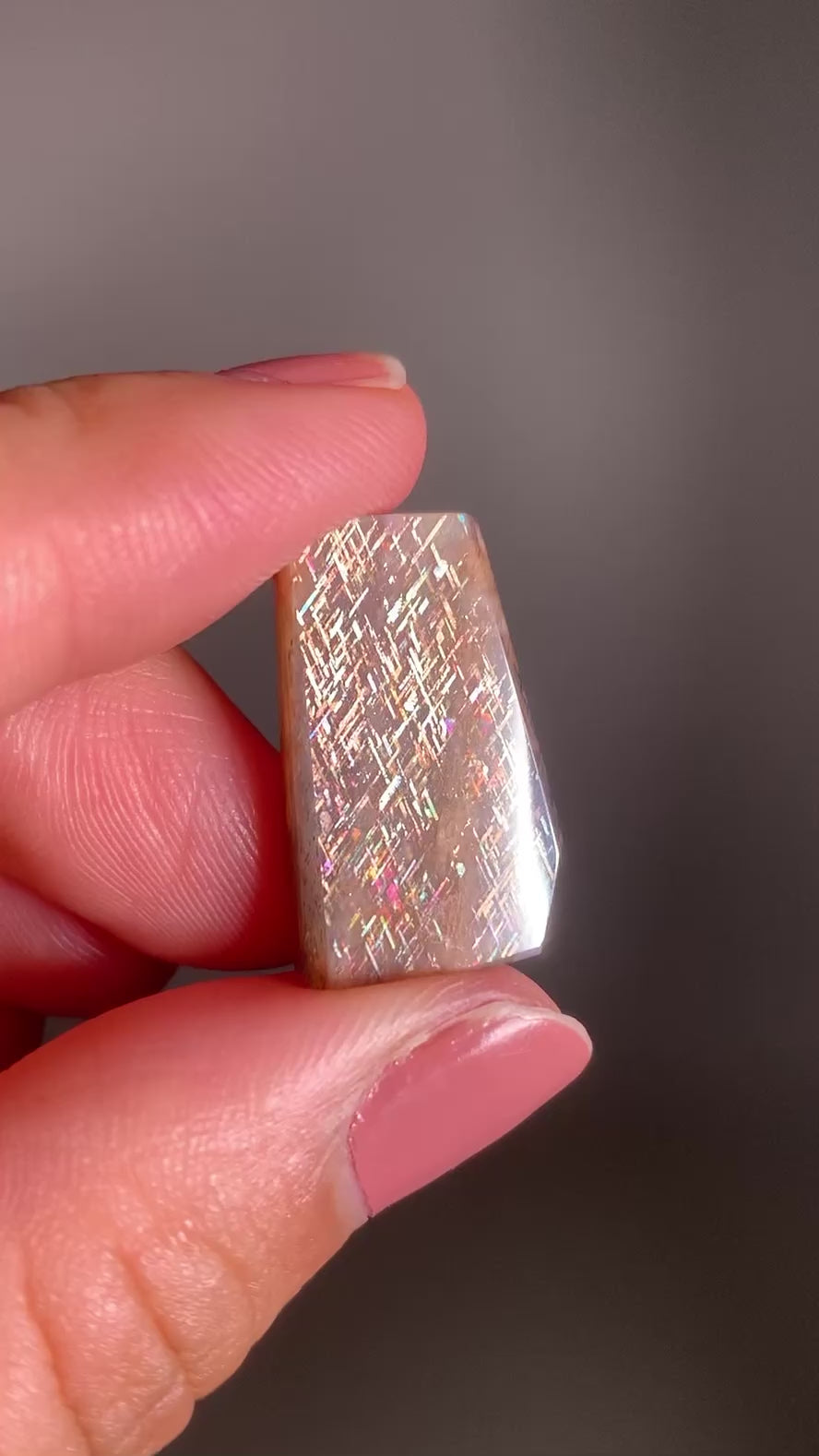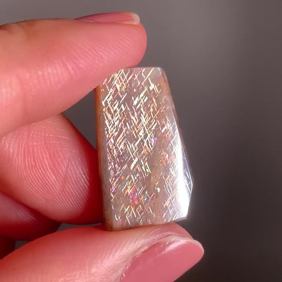 Rainbow Lattice Sunstone from Tanzania is a rare gem with sparkling lattice patterns and flashes of rainbow color — a natural stunner that’s totally unique.